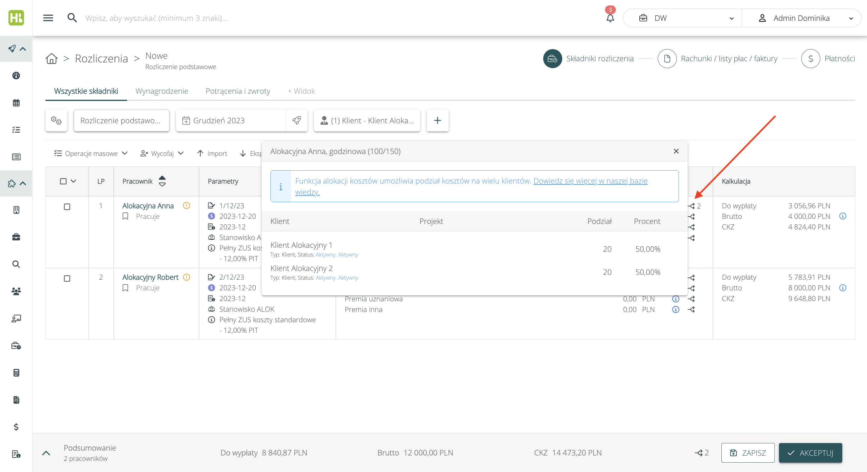Podczas naliczania wynagrodzeń, na pierwszym kroku rozliczenia system pozwoli rozdzielić każdy składnik wynagrodzenia pracownika na wielu Klientów. Podgląd alokacji kosztów dostępny jest po kliknięciu na ikonę :
