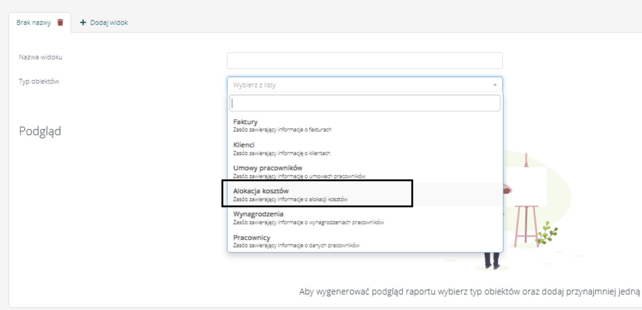 W module raportów, w sekcji raportów niestandardowych, umożliwiliśmy stworzenie raportu z danymi dotyczącymi alokacji kosztów. Aby wygenerować taki raport, w polu Typ obiektów należy wybrać „Alokacja kosztów”: