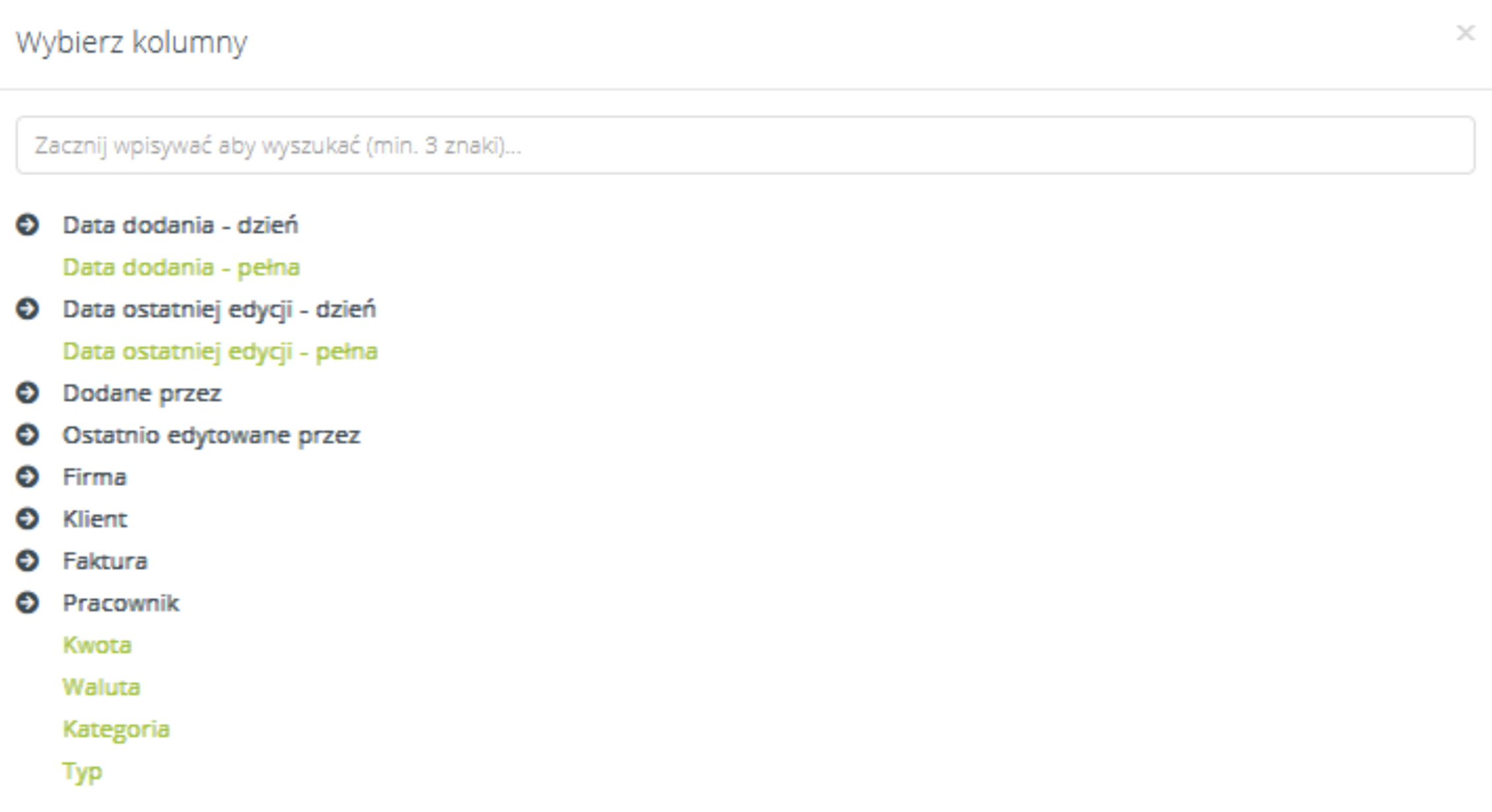 Dostępne są kolumny: