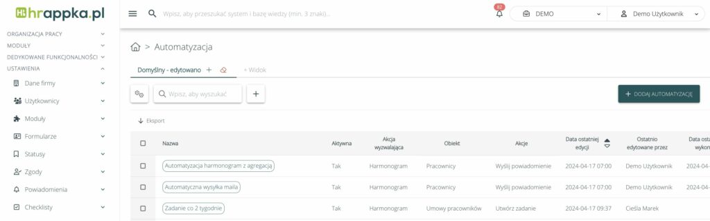 Z poziomu listy automatyzacji widoczne są m.in.: