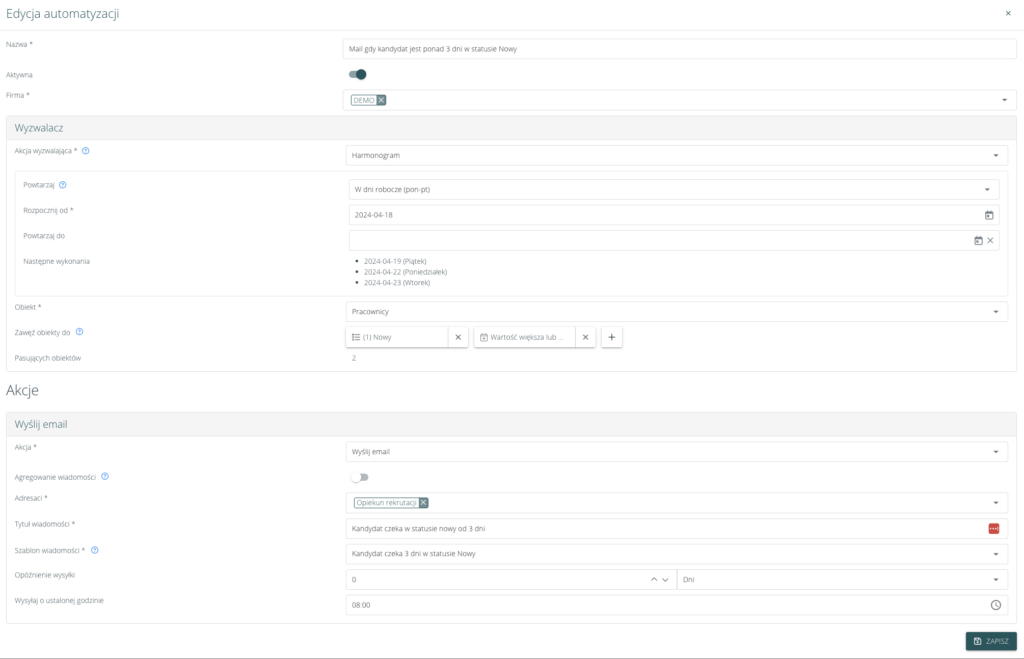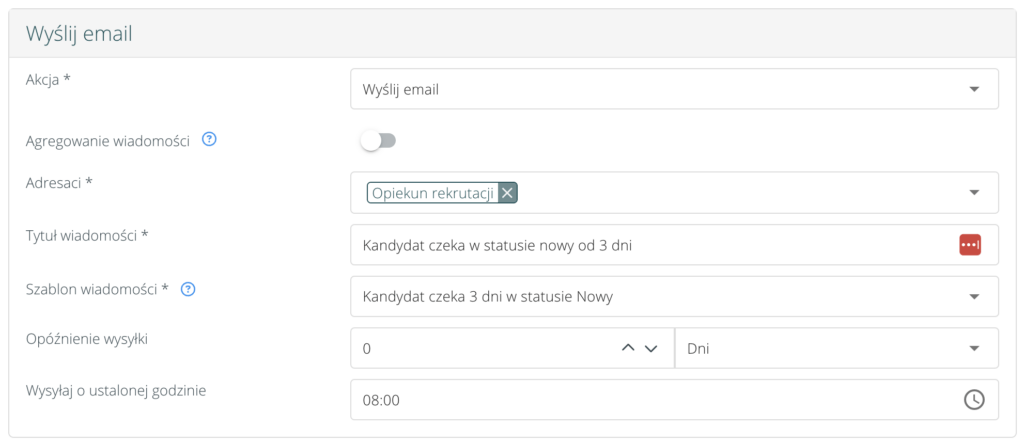 - gdy obiekt (np. pracownik, Klient) znajduje się określoną liczbę dni w wybranym statusie (np. gdy status kandydata od trzech dni to “Nowy”, system automatycznie może wysłać maila z powiadomieniem do wybranej osoby)
