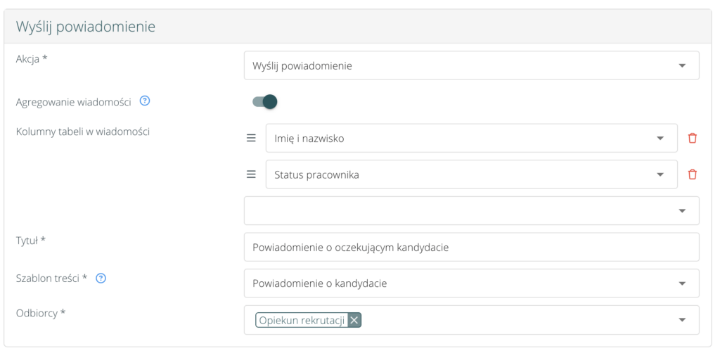 - Kolumny tabeli w wiadomości – po włączeniu opcji agregowania wiadomości, należy zdefiniować jakie dane powinna zawierać tabela w mailu, który informował będzie o wielu analogicznych akcjach wyzwalających jednocześnie. Dostępne kolumny tabeli zależą od wybranego wcześniej obiektu.