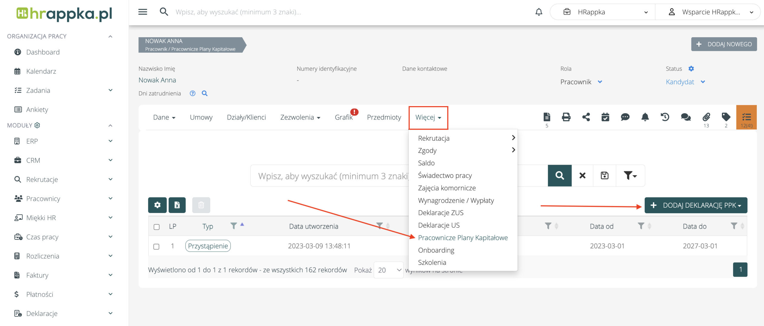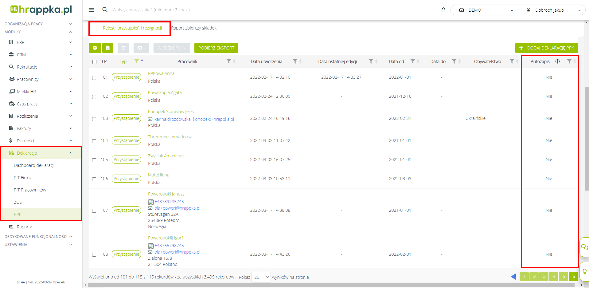 System HRappka nie generuje autozapisu do PPK automatycznie. Powinien to zrobić użytkownik. Poniższa instrukcja pokazuje jak odnaleźć pracowników, którzy mają wprowadzone deklaracje rezygnacji z datą „Do” późniejszą niż 28.02.2023 (takie rezygnacje zgodnie z obowiązującymi przepisami obowiązują do dnia 28.02.2023) i jak wygenerować deklaracje przystąpienia / rezygnacji ponownie.