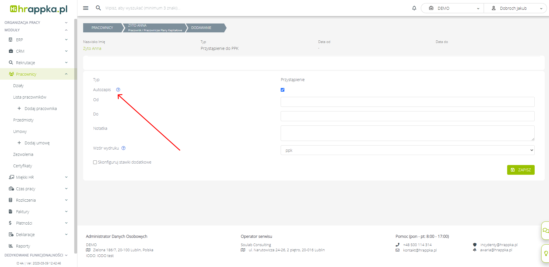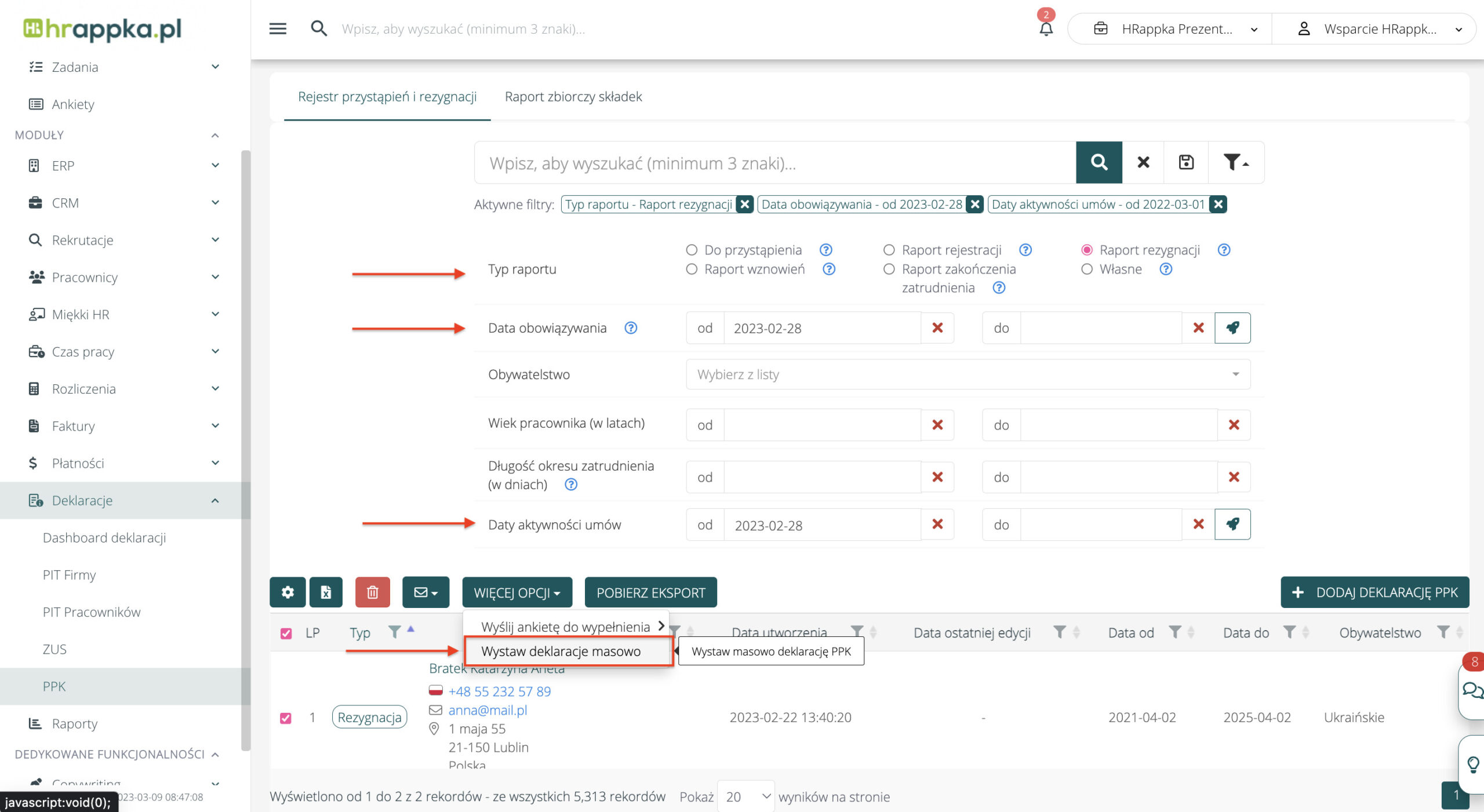 System HRappka nie generuje autozapisu do PPK automatycznie. Powinien to zrobić użytkownik. Poniższa instrukcja pokazuje jak odnaleźć pracowników, którzy mają wprowadzone deklaracje rezygnacji z datą „Do” późniejszą niż 28.02.2023 (takie rezygnacje zgodnie z obowiązującymi przepisami obowiązują do dnia 28.02.2023) i jak wygenerować deklaracje przystąpienia / rezygnacji ponownie.