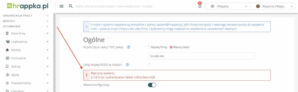 Jeżeli wprowadziłeś zmiany dot. hasła na swojej skrzynce email, to w systemie HRappka należy zaktualizować hasło w ustawieniach poczty.