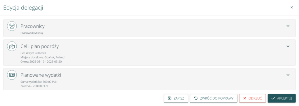 Po wejściu we wniosek delegacji (ikona edycji) akceptujący może: