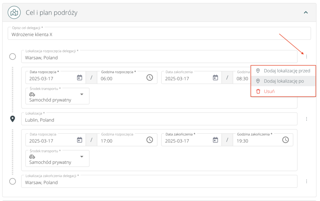 - Lokalizację delegacji oraz datę i godzinę rozpoczęcia i zakończenia oraz środek transportu