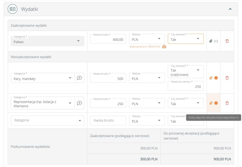 - dodawać szczegóły nowych, niezaakceptowanych wcześniej wydatków.