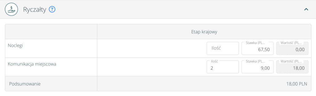 Po zdefiniowaniu wydatków można przejść do sekcji „Ryczałty” i zdefiniować ilość noclegów oraz przejazdów komunikacją miejscową. Ryczałty przysługują w przypadku braku dokumentów potwierdzających poniesione koszty w delegacji, takich jak faktura za nocleg lub bilety za przejazdy lokalne. Ryczałty należy wprowadzić, jeżeli nocleg / dojazdy nie zostały zapewnione przez pracodawcę i nie posiadasz potwierdzenia wydatków. Ryczał zostanie naliczony zgodnie z obowiązującymi ustawowymi stawkami.