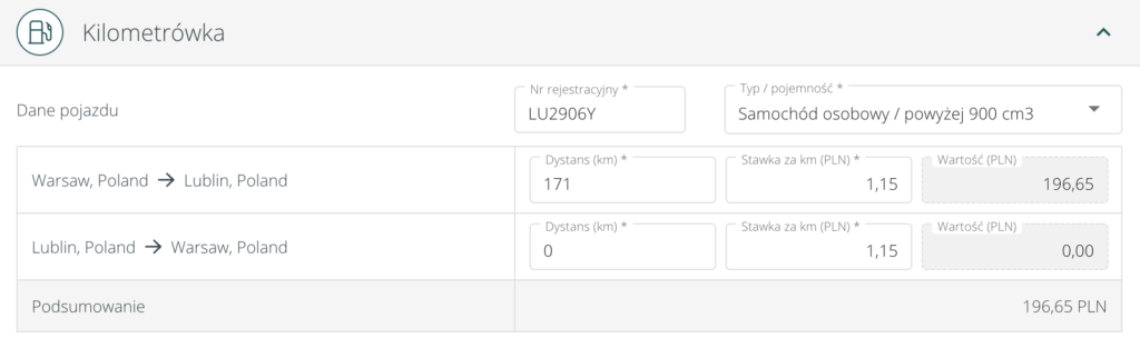 Sekcja kilometrówki pojawi się, jeżeli podróż odbywa się samochodem prywatnym pracownika.