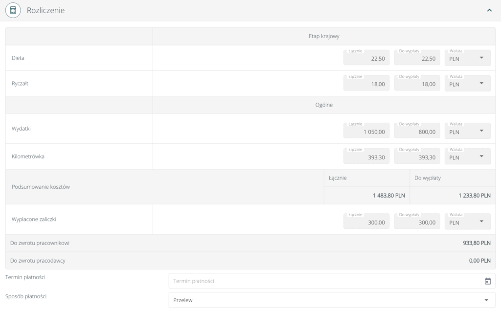 Przygotowując delegację do rozliczenia należy uzupełnić poniesione wydatki, ryczałty (jeżeli nocleg / dojazdy nie zostały zapewnione przez pracodawcę i wnioskujący nie posiada potwierdzenia wydatków), zagwarantowane wyżywienie oraz kilometrówkę (jeżeli podróż odbywała się samochodem osobistym).