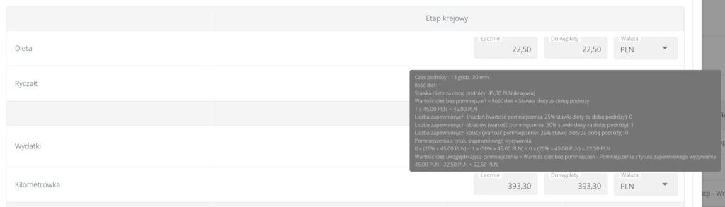 - rozliczanie delegacji, w tym automatyczne naliczanie diet, ryczałtów, czy kilometrówki