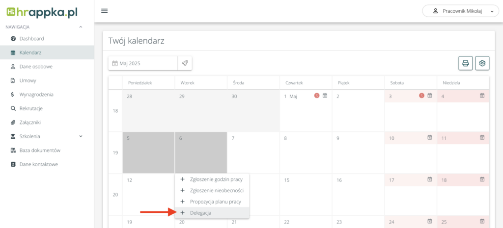 Pracownik może dodać delegację z poziomu grafiku na portalu pracownika: