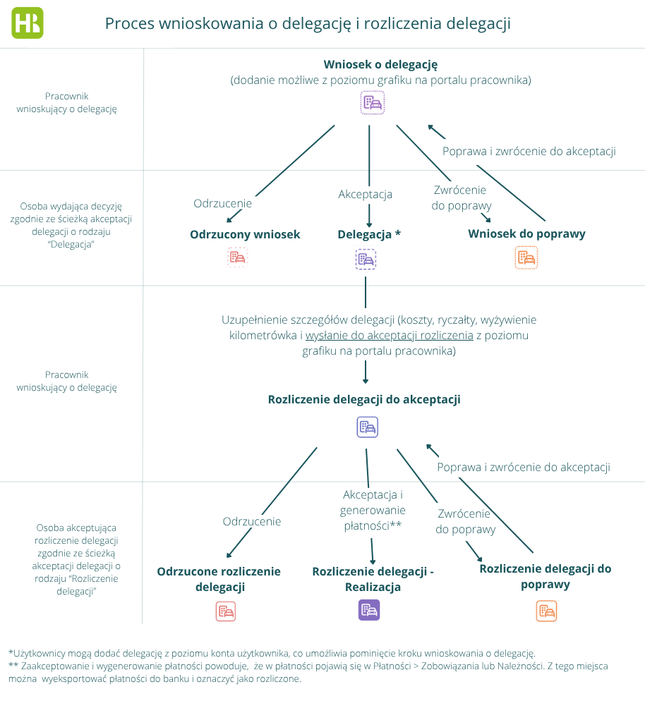 - konfigurację ścieżek akceptacji wniosków o delegację oraz rozliczeń delegacji