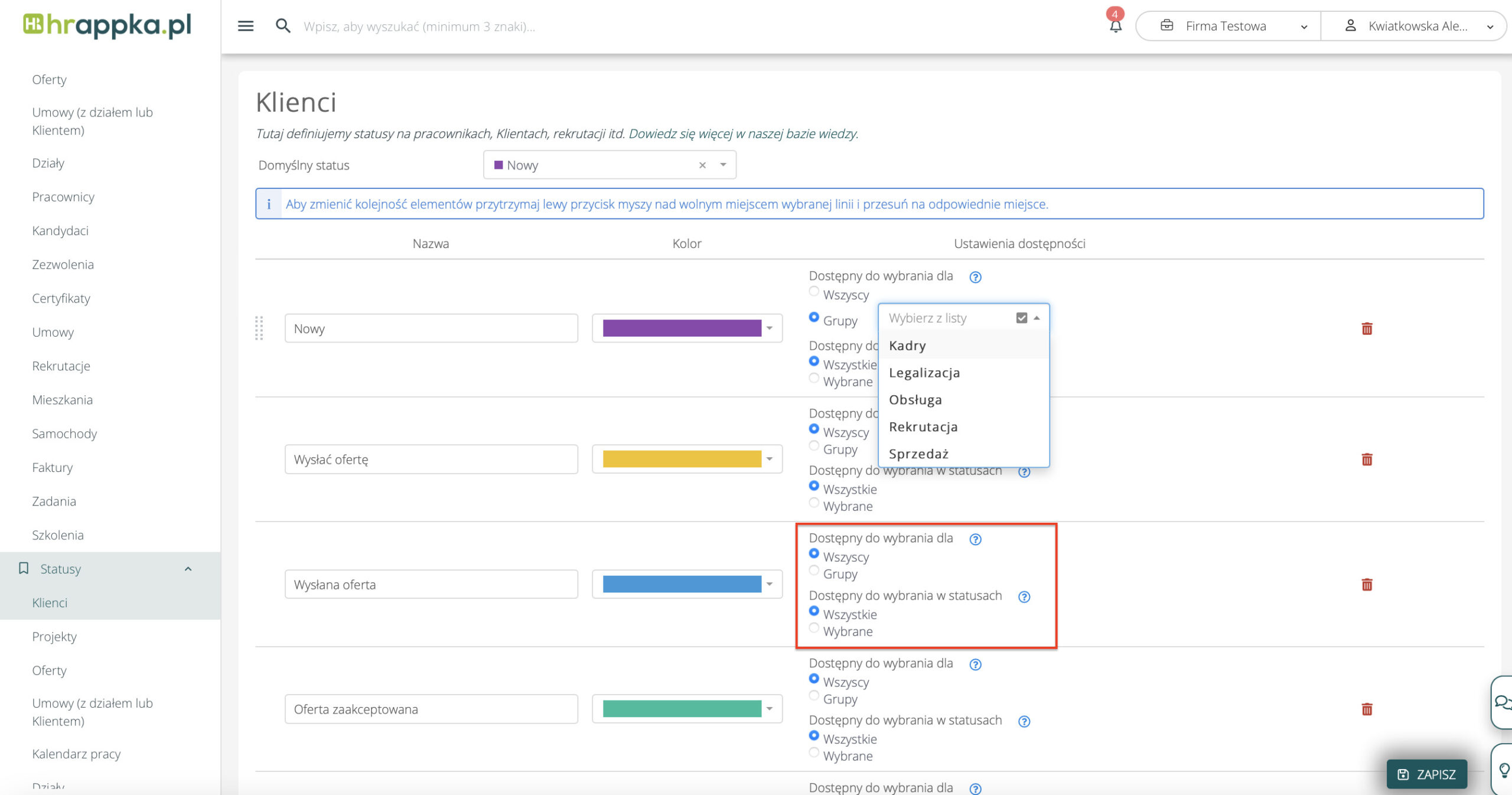 Widoczność statusów można definiować w Ustawienia > Statusy, w kolumnie „Ustawienia widoczności", opcja „Dostępne dla" w wierszu wybranego statusu.