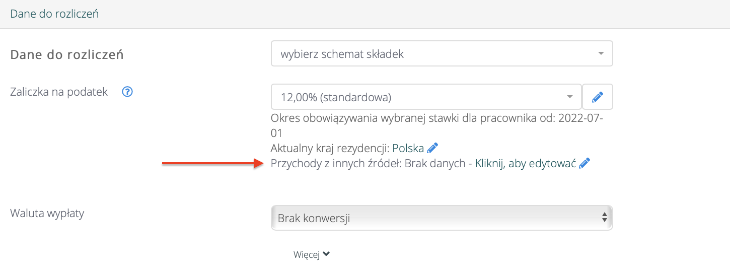 System umożliwia wprowadzenie kwot przychodów z innych źródeł, które wpływają na osiągnięcie wyższego progu podatkowego i limitu ZUS oraz faktu rozliczenia się wspólnie z małżonkiem. Opcja ta jest dostępna na profilu pracownika w sekcji Dane do rozliczeń.