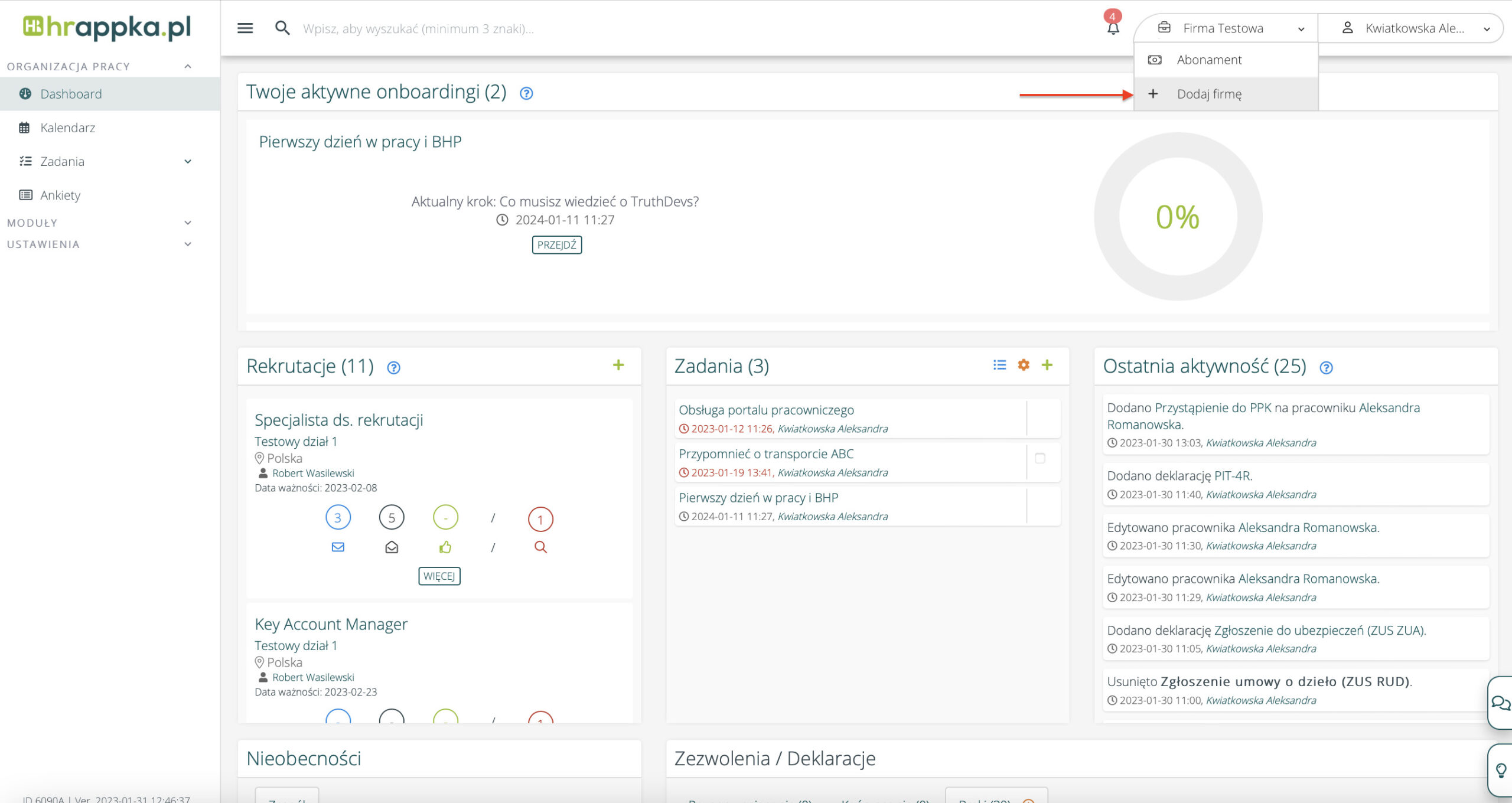 W zależności od subskrypcji można dodać wiele powiązanych firm. Aby dodać nową firmę należy kliknąć na nazwę firmy w prawym górnym rogu, a następnie wybrać opcję „Dodaj firmę”: