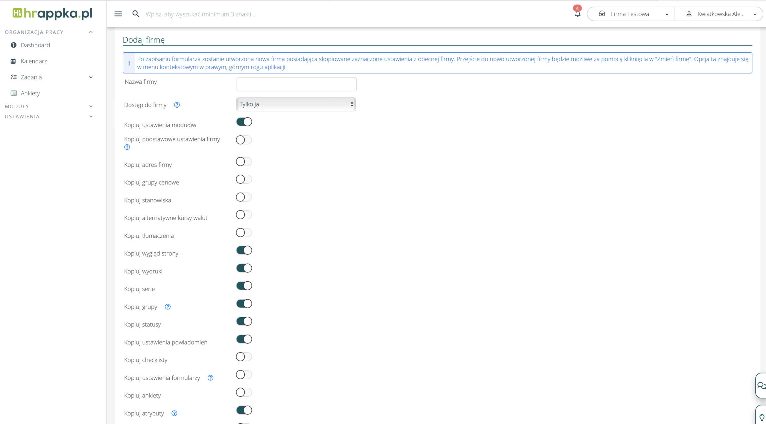 - Zaznaczyć elementy konfiguracji systemu, które chcesz aby zostały skopiowane na nową firmę. Brak zaznaczenia opcji kopiowania poszczególnych elementów spowoduje, że nie zostaną one przeniesione na nową firmę. Będzie je można skonfigurować w Ustawieniach.