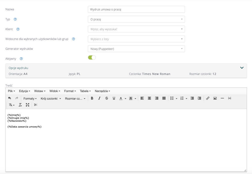W Ustawienia > Szablony > Wydruki > Dodaj nowy wydruk, możemy definiować wydruki dla każdego typu umowy. Na załączonym przykładzie utworzono wydruk dla umowy o pracę.