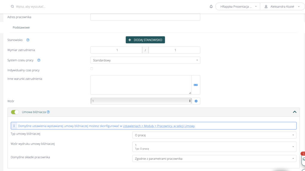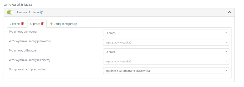 Następnie w Ustawienia > Moduły > Pracownicy w sekcji Umowa bliźniacza możemy ustalić dla jakich umów w systemie mają się tworzyć umowy bliźniacze.