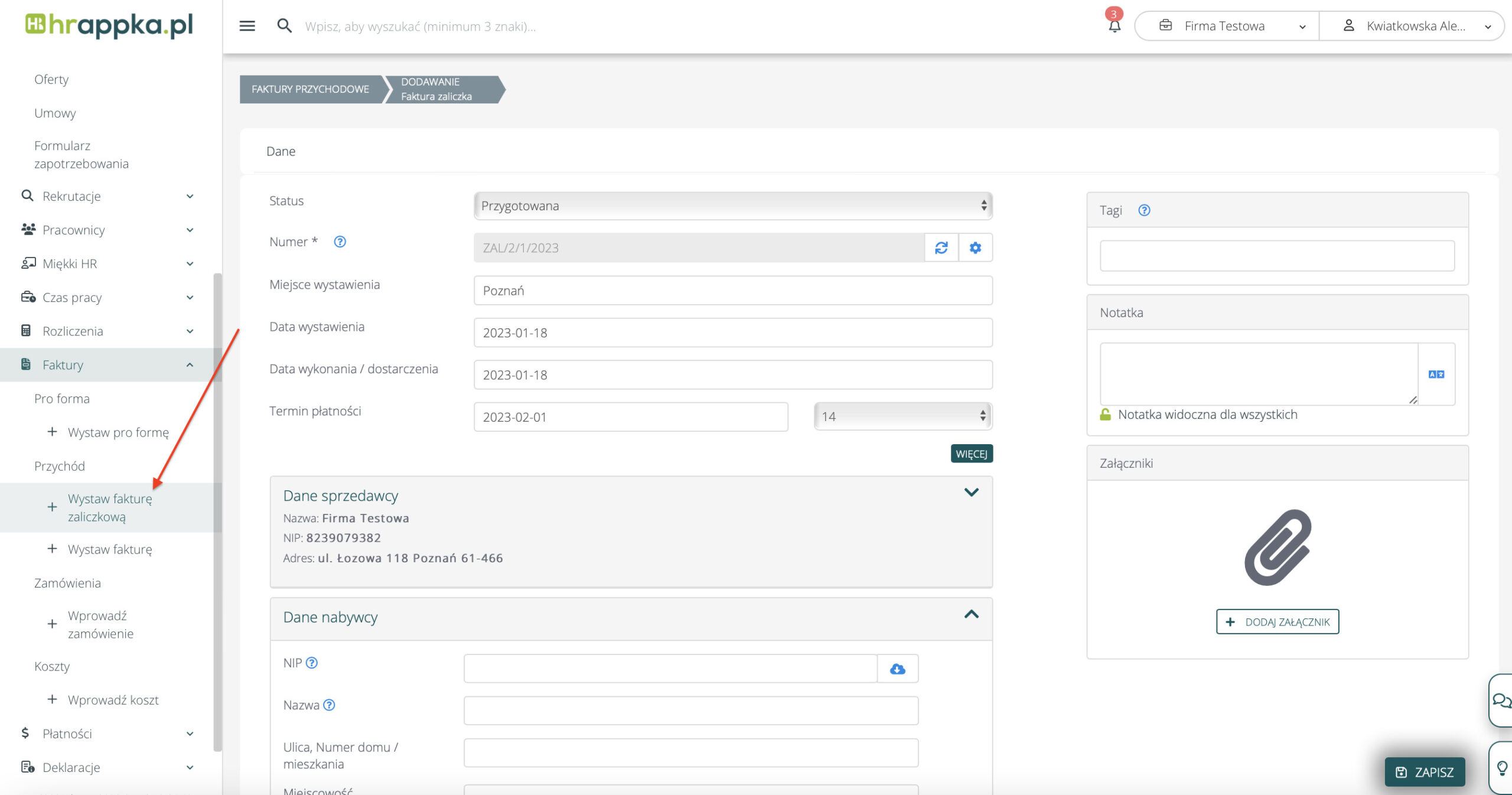 Fakturę zaliczkową można dodać z poziomu zakładki Faktury > Przychód>  “+ Wystaw fakturę zaliczkową”. Faktury zaliczkowe można znaleźć na liście faktur przychodowych. Z poziomu tej listy istnieje również możliwość wyfiltrowania faktur zaliczkowych, korzystając z filtra typ i wybierając faktury zaliczkowe.