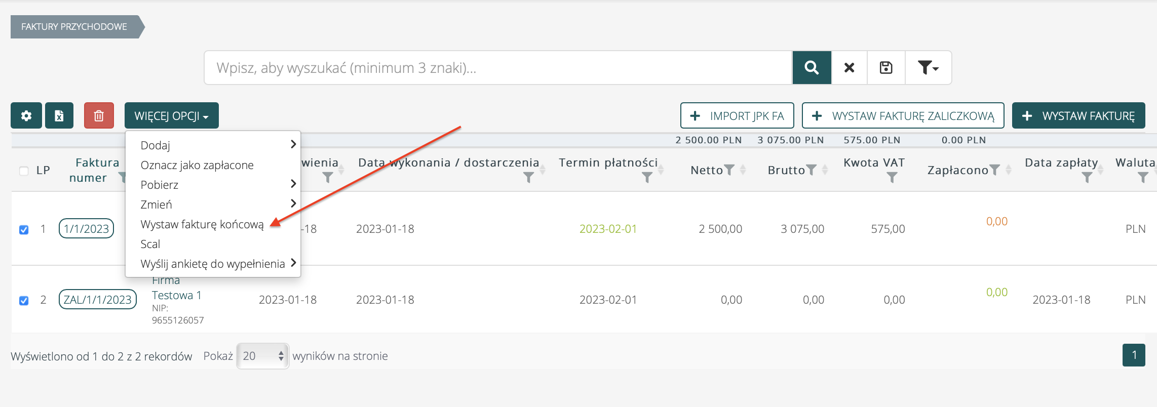Z faktur zaliczkowych można również wystawić fakturę końcową. W tym celu należy wejść na listę faktur przychodowych, wybrać faktury zaliczkowe, które chcemy uwzględnić w fakturze, a następnie korzystając z przycisków nad tabelą, wybrać Więcej opcji > Wystaw fakturę końcową.