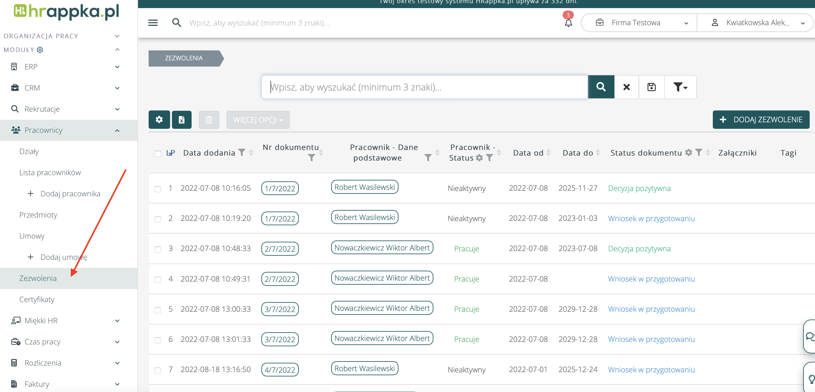 Dokumenty legalizujące pobyt i pracą są dostępne w Pracownicy >Zezwolenia lub po wejściu na profil pracownika, którego obywatelstwo jest inne niż polskie (zakładka Zezwolenia > Legalizacyjne).