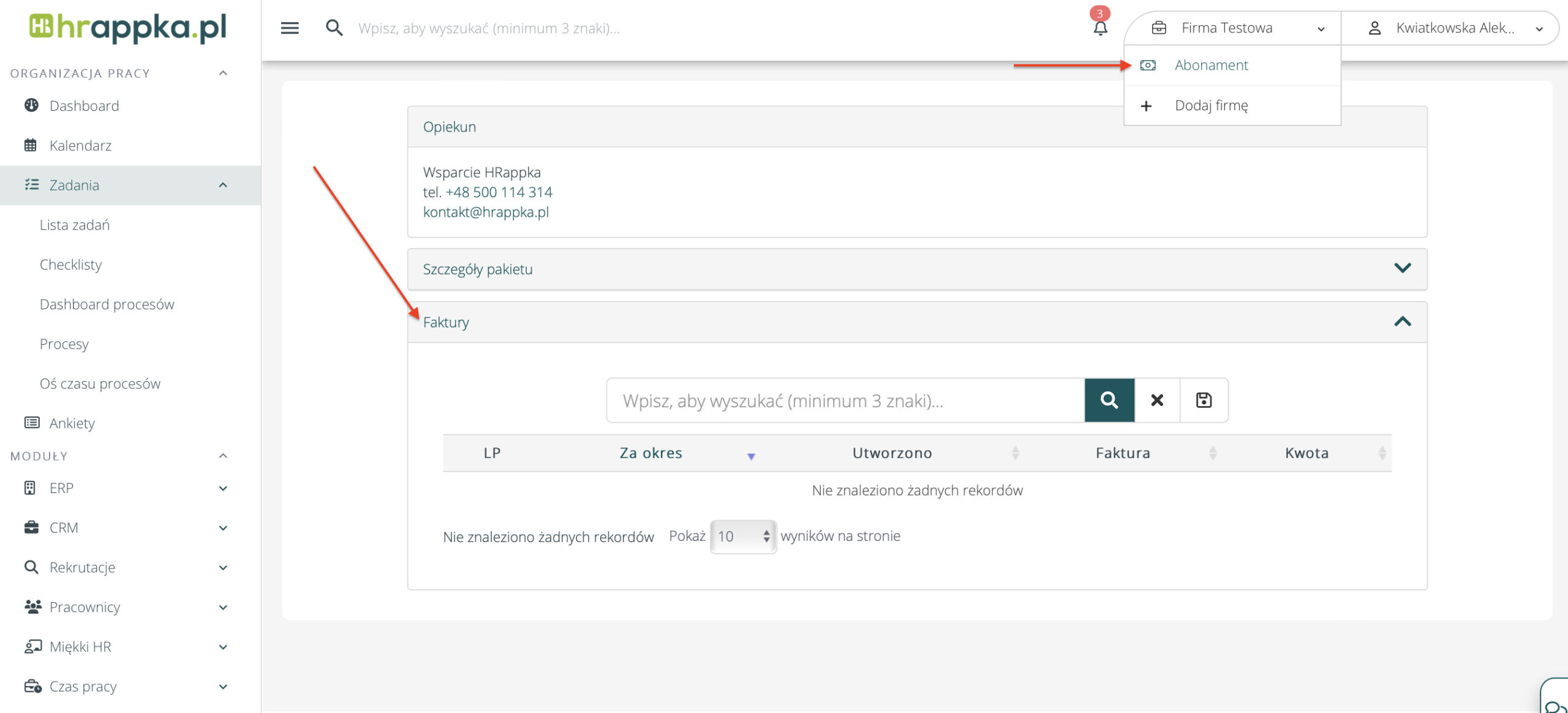 Aby znaleźć faktury za korzystanie z systemu, należy po kliknięciu na nazwę firmy w prawym górnym rogu wybrać Abonament. Na samym dole znajduje się zakładka Faktury, gdzie możemy przejrzeć wszystkie dotychczasowe faktury.