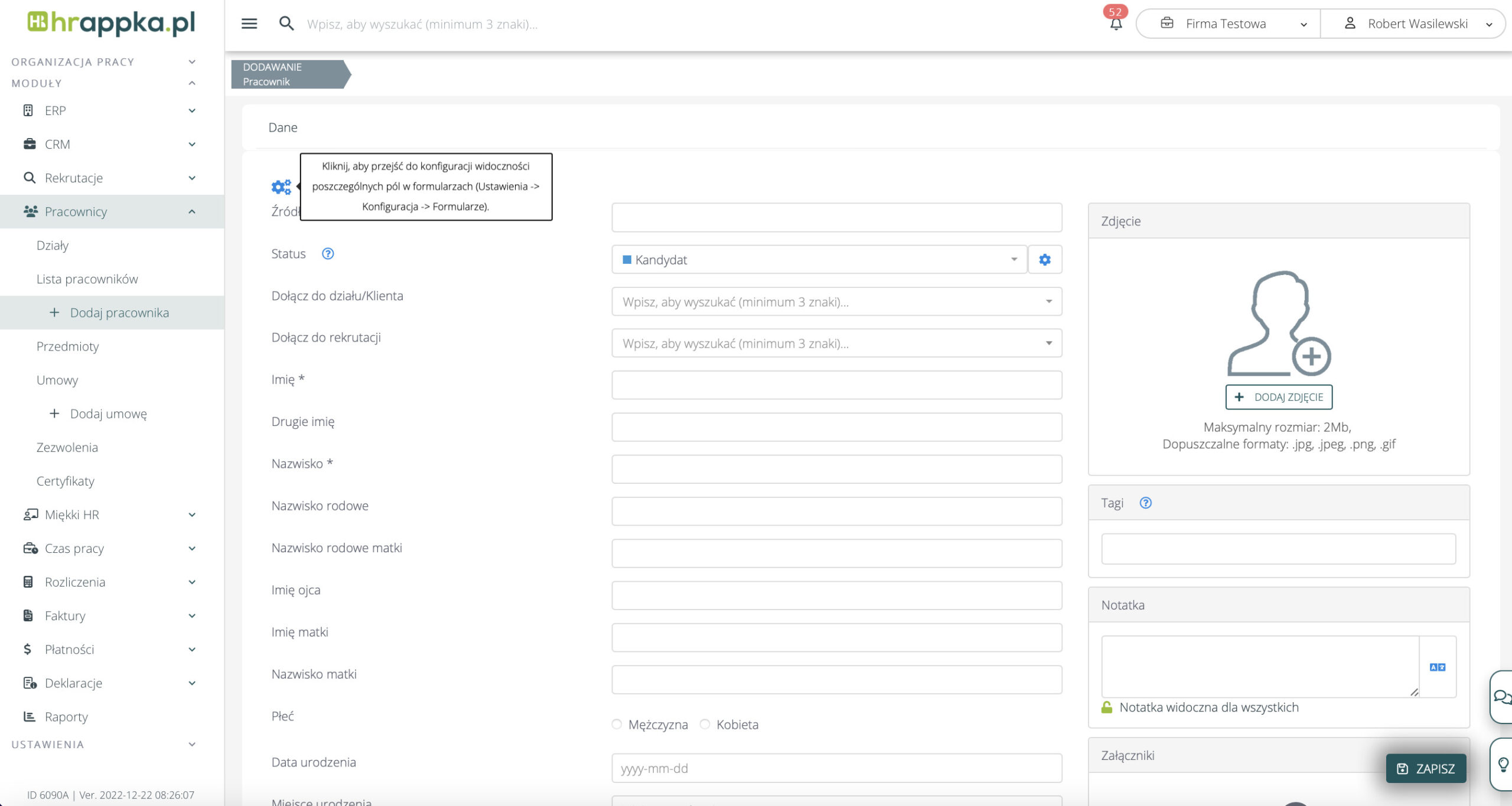 W tym miejscu dodasz wszystkie informacje na temat pracownika, a klikając w zębatkę w lewym górnym rogu, zdecydujesz, które pola mają się pojawiać na formularzu.