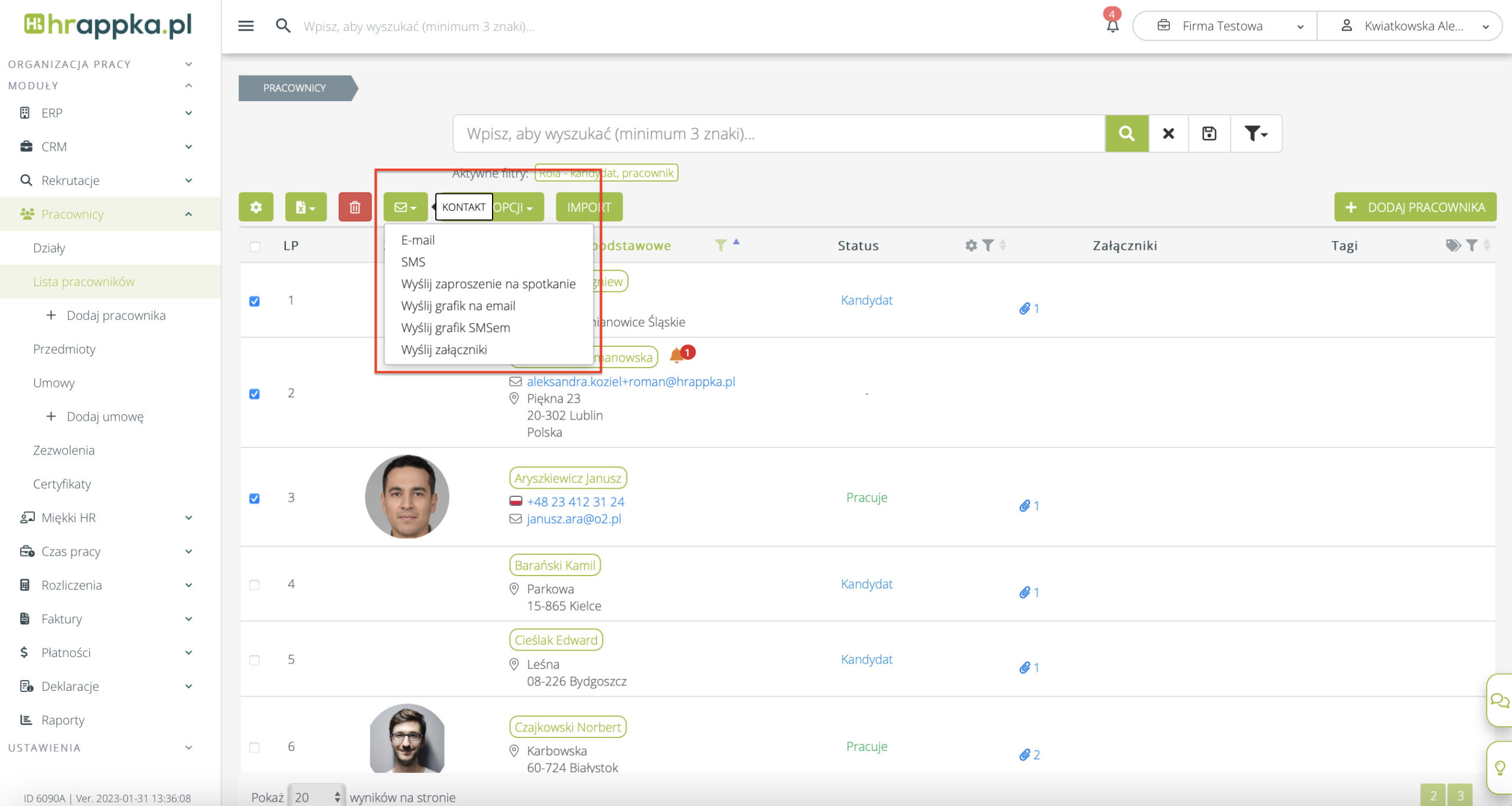 W systemie można zrobić masową wysyłkę e-mail do pracowników, kandydatów, czy Klientów których mamy w bazie.