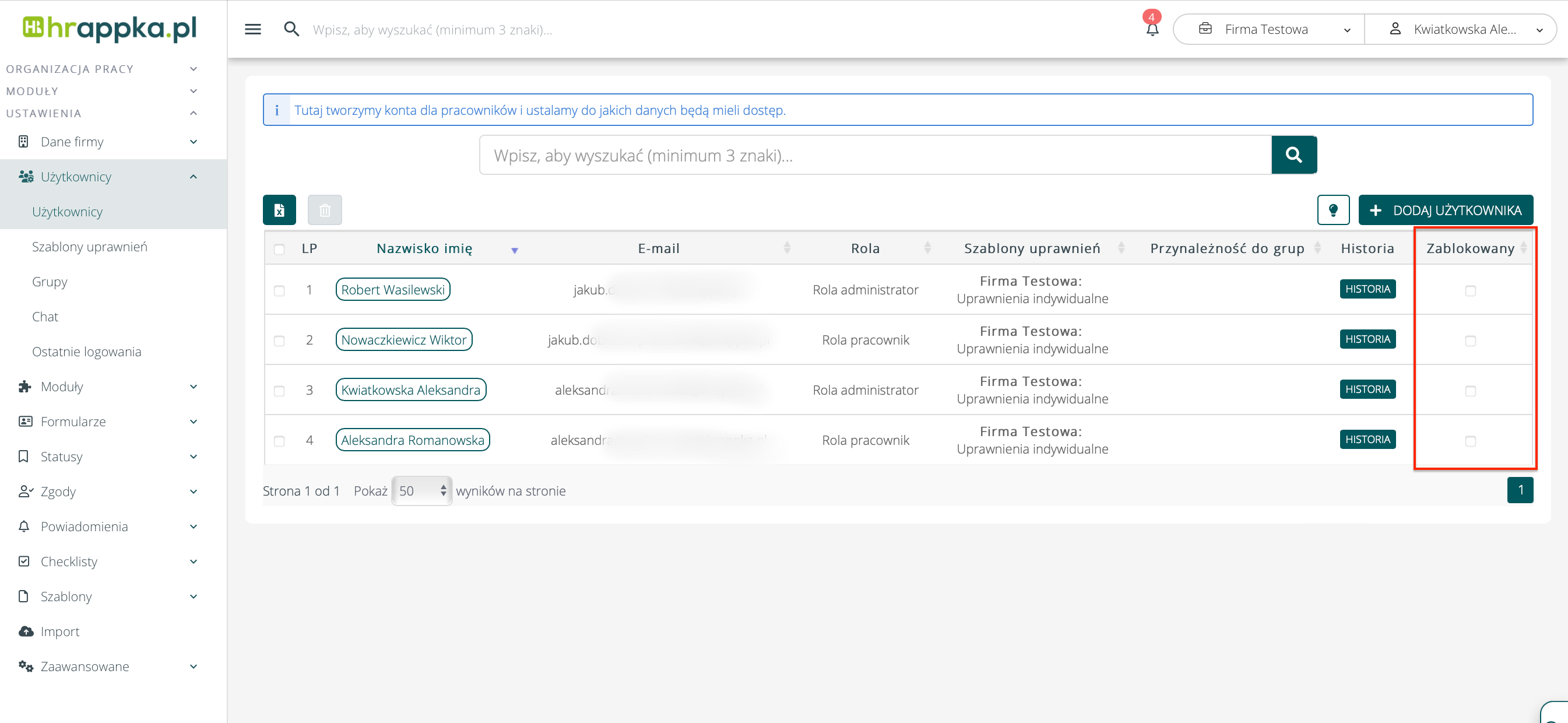 Administrator może odblokować Twoje konto w Ustawienia > Użytkownicy > Użytkownicy, wyszukując użytkownika na liście i odznaczając checkbox w kolumnie Zablokowany.