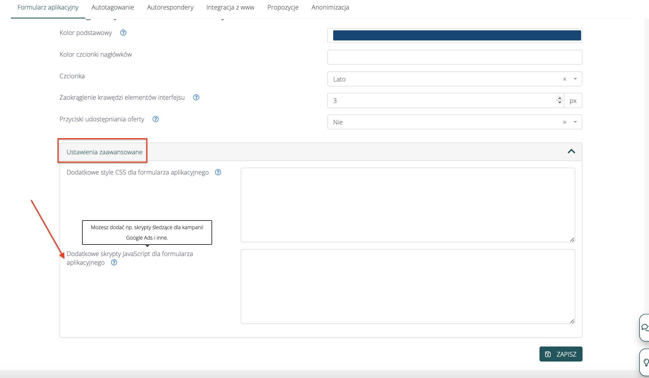 W Ustawienia > Moduły > Rekrutacje > Formularz aplikacyjny, w sekcji Ustawienia zaawansowane (na dole strony) istnieje możliwość wstawienia skryptów śledzących np. Google Ads, czy Facebook Pixel – umożliwia to większe możliwości analityczne czy reklamowe. Skrypty wstawione w tym miejscu będą wstawione do wszystkich formularzy aplikacyjnych.