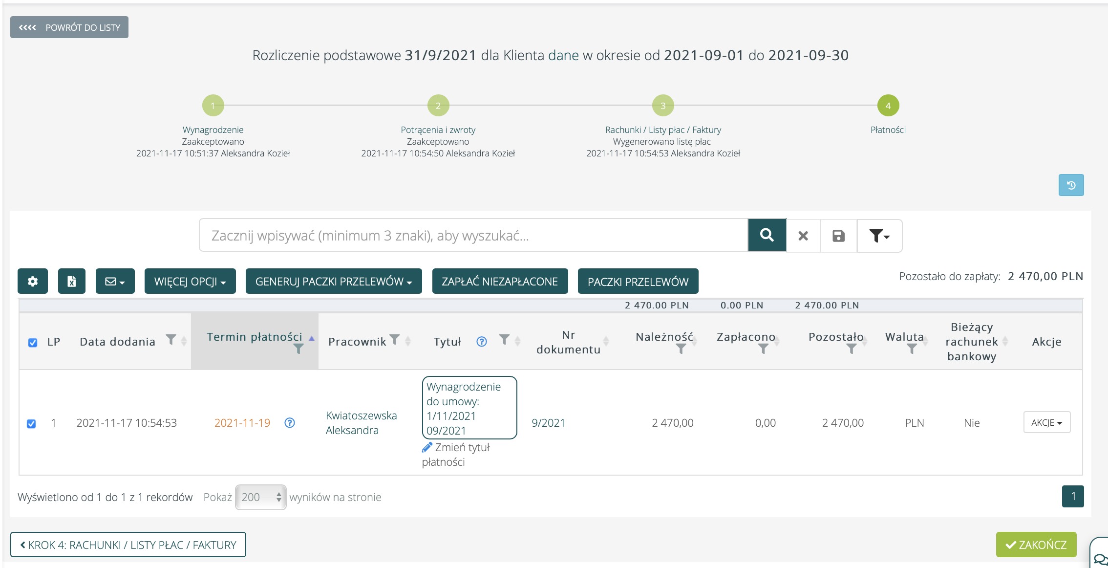 przejść do sekcji Rozliczenia > Dashboard rozliczeń, wybrany miesiąc np. listopad, wybrany Klient, rozliczenie pracowników, wybranie Rachunki/Listy płac, w których jest pracownik.