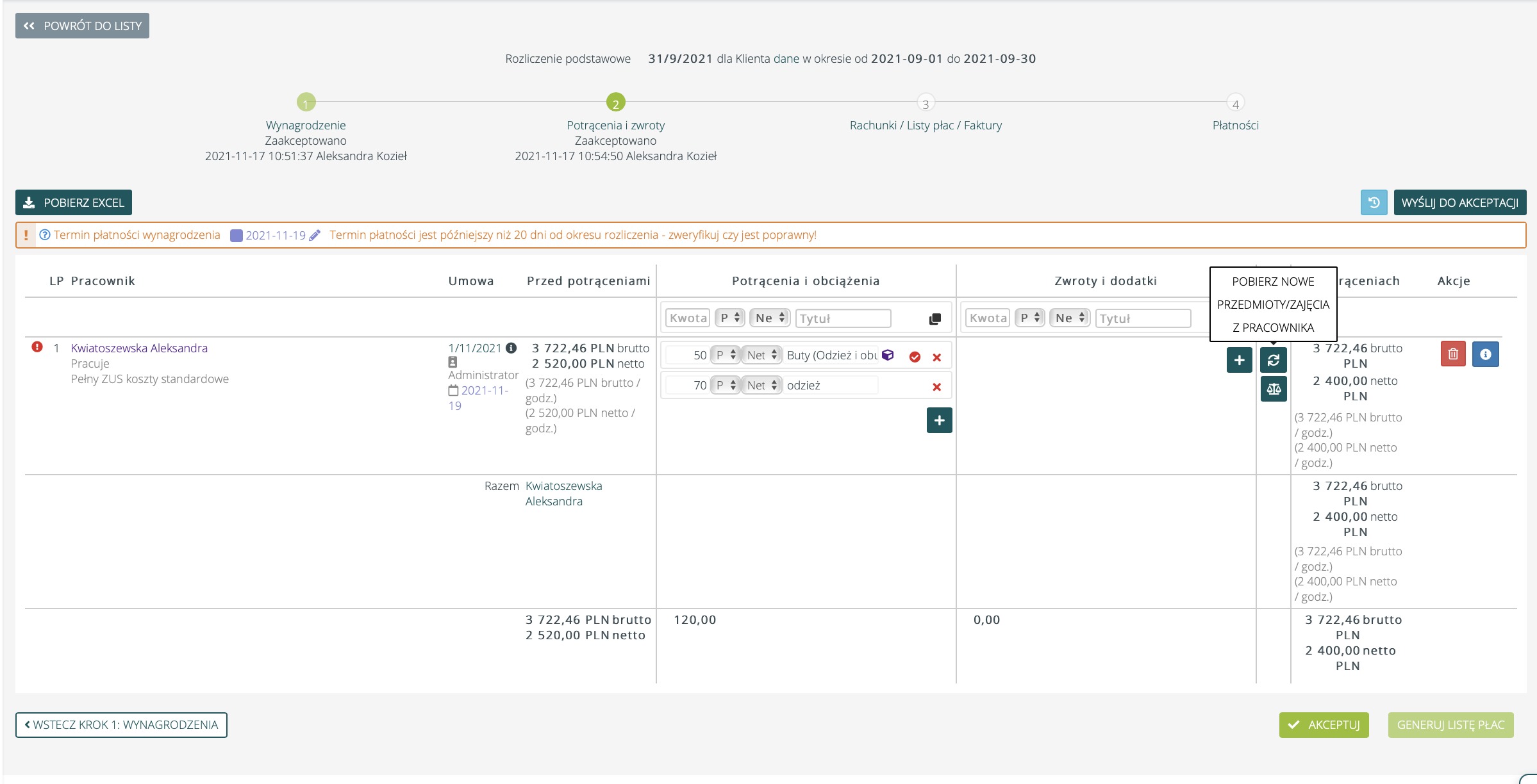 Następnie po przejściu w rozliczenie, należy wycofać Rachunek/Listę płac korzystając z przycisku Cofnij Listę płac.