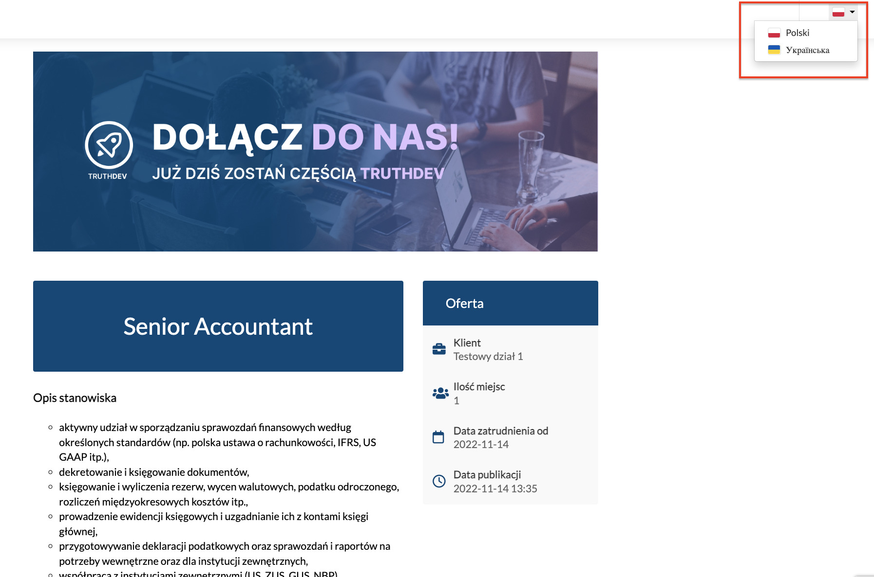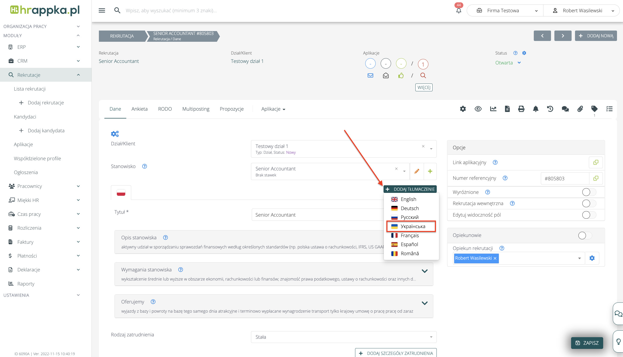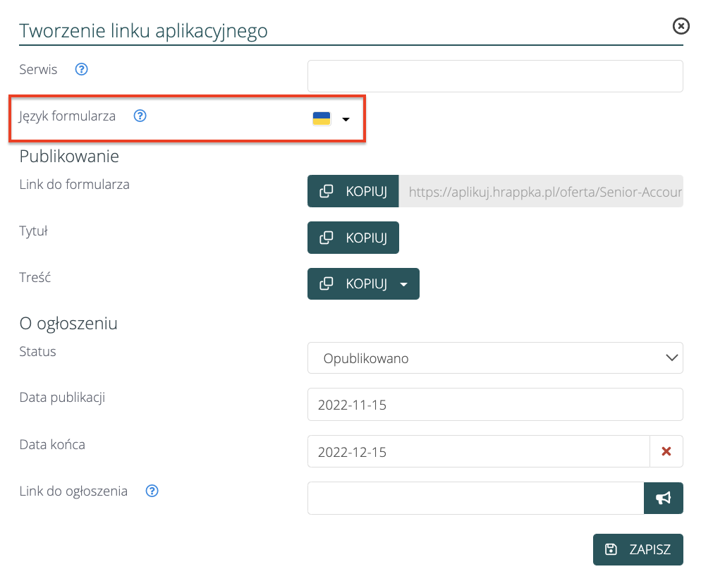 Po zapisaniu, zmiany zostaną zastosowane na formularzu, i po wybraniu ukraińskiej wersji językowej formularza, pojawi się skonfigurowane tłumaczenie. HRappka umożliwia również sprawne zatrudnianie cudzoziemców, poprzez: