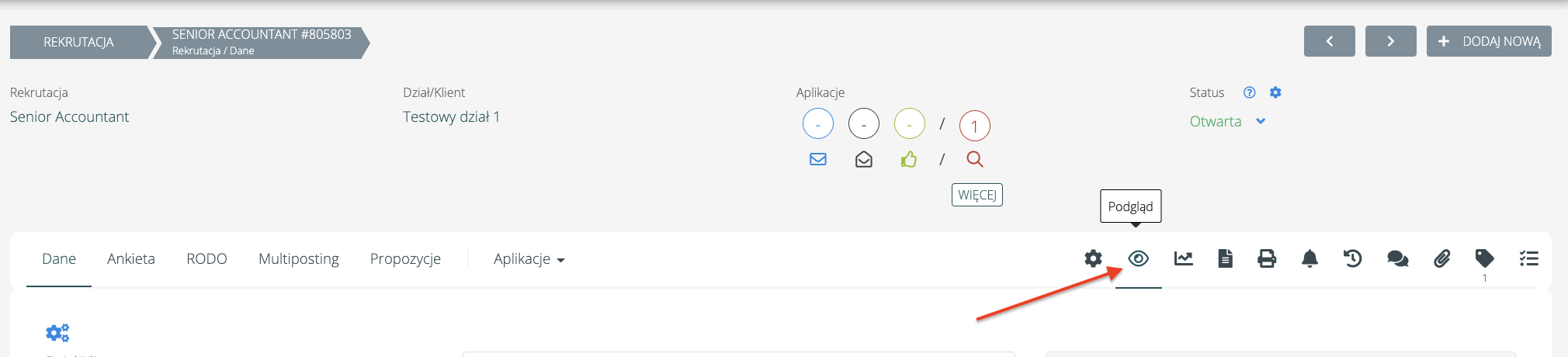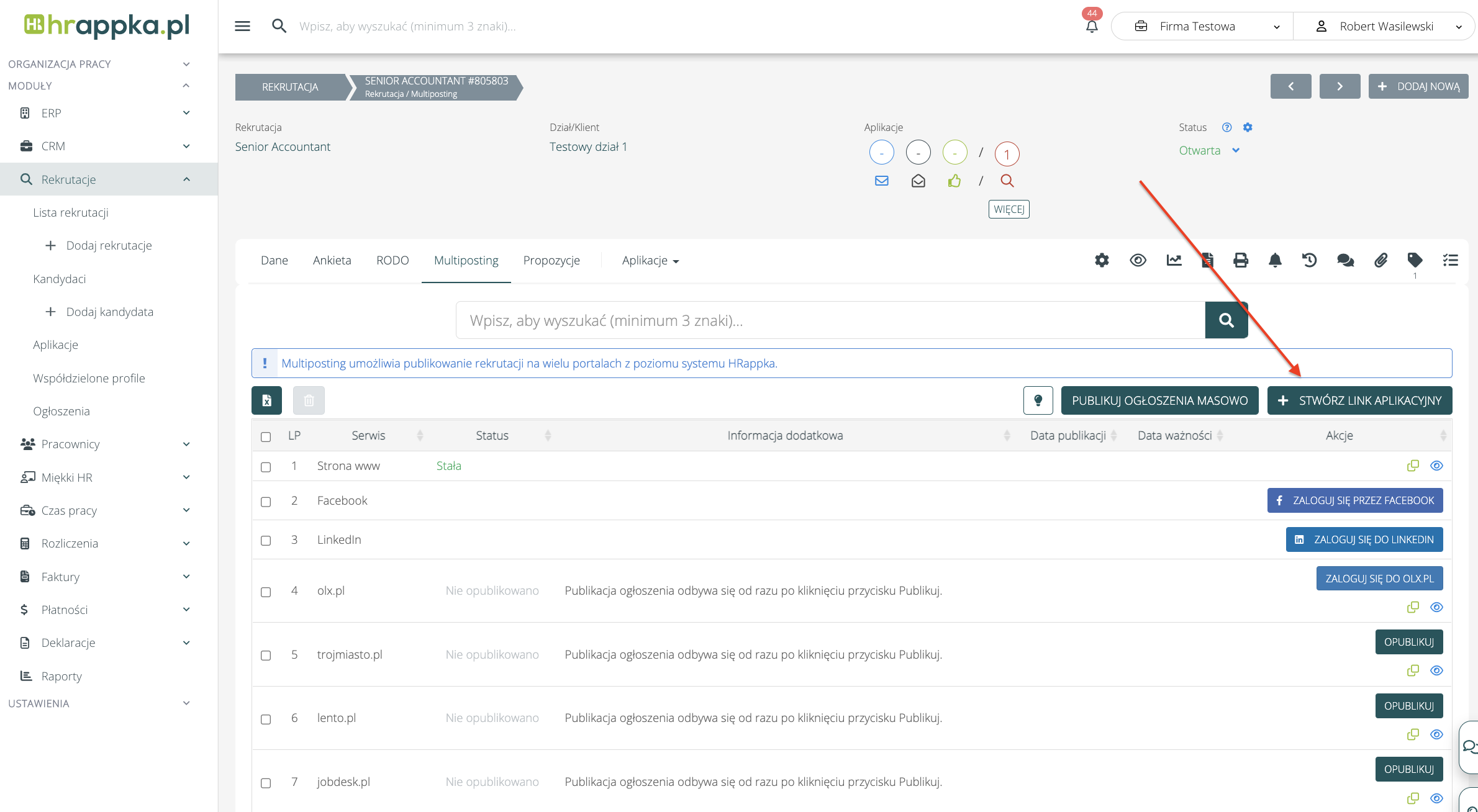 Na wybranej rekrutacji przejdź do zakładki multiposting i kliknij „Dodaj link aplikacyjny".