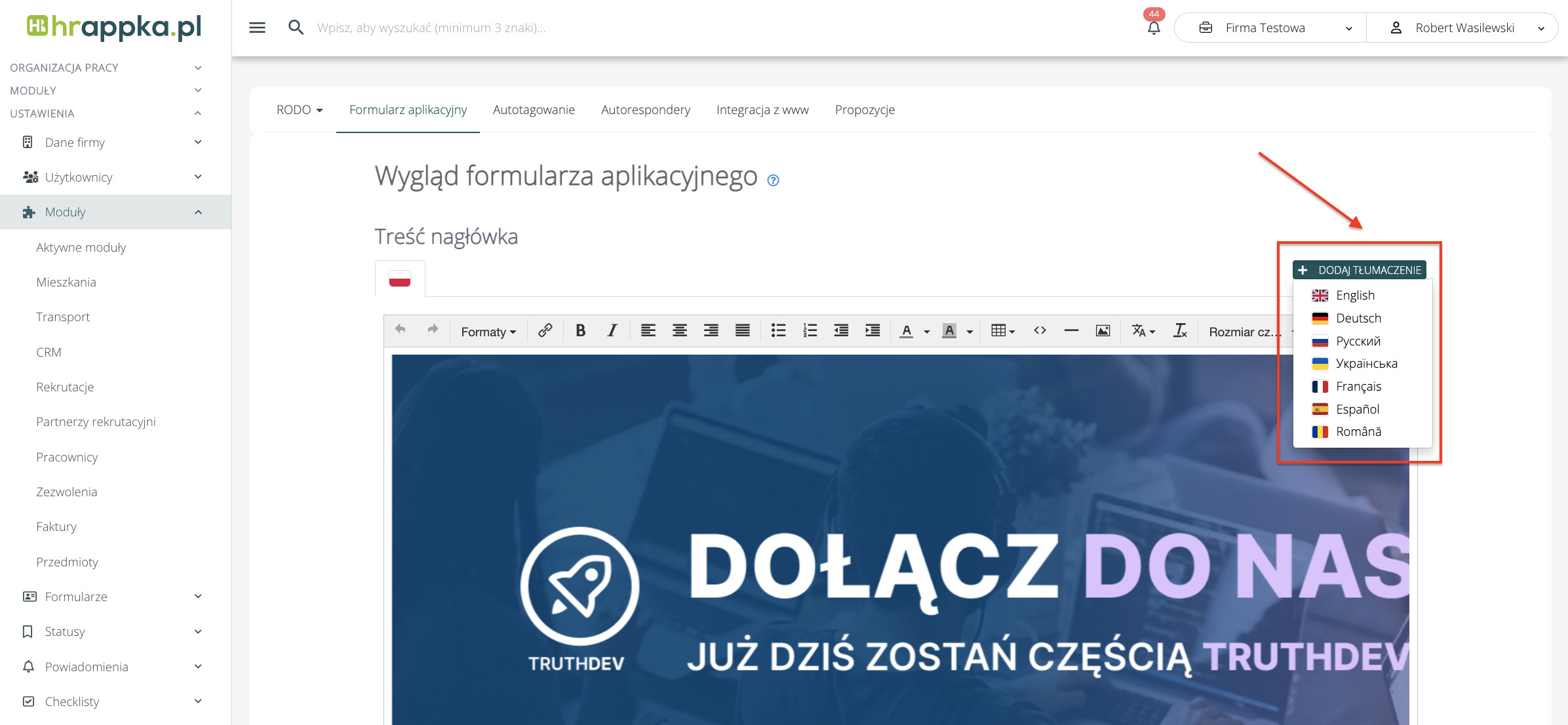 Przejdź do Ustawienia > Moduły > Rekrutacje > Formularz aplikacyjny i w sekcji Treść nagłówka i/lub Treść stopki, kliknij w przycisk „+ Dodaj tłumaczenie". Treść zostanie automatycznie przetłumaczona. Jeżeli chcesz – możesz wprowadzić zmiany w tłumaczeniu.