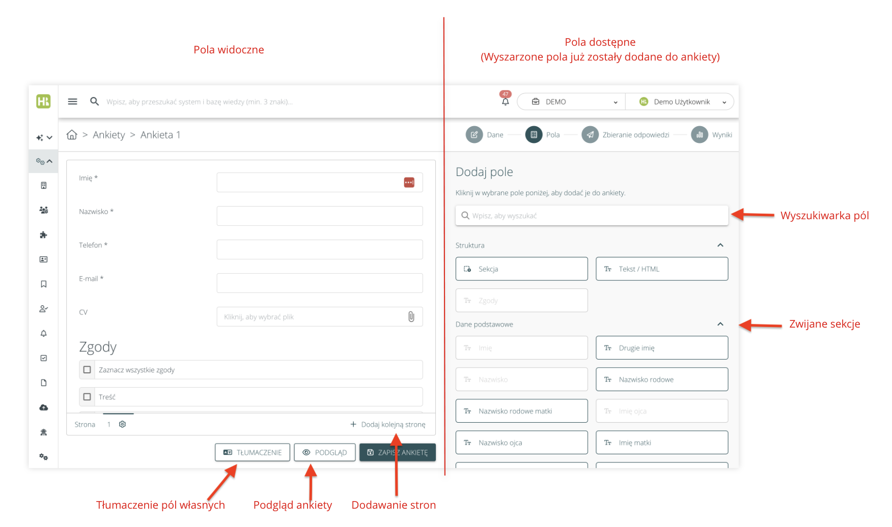 HRappka automatycznie przetłumaczy pola systemowe, ale pola własne (atrybuty) należy przetłumaczyć samodzielnie. Aby to zrobić należy przejść do Ankiety >Ankieta i kliknąć w ikonę tłumaczenia na dole pod ankietą: