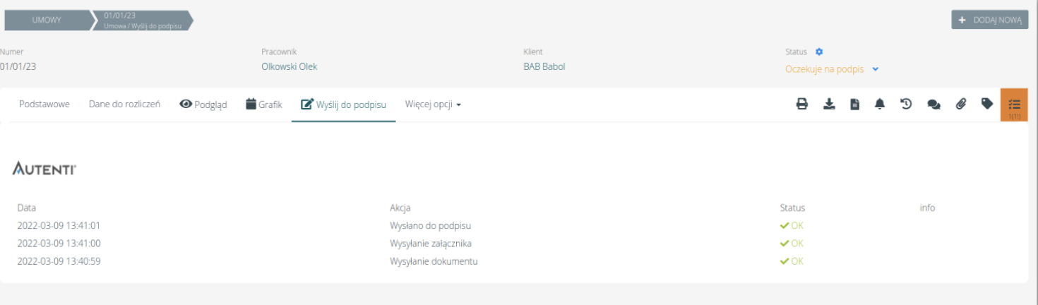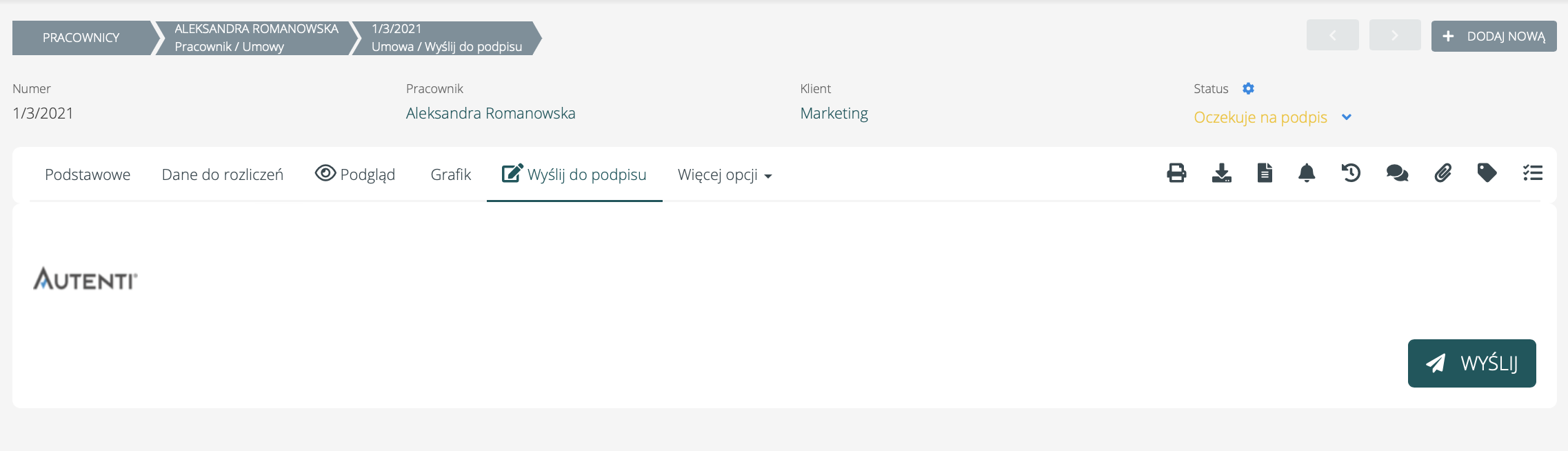 Aby podpisać umowę podpisem elektronicznym Autenti, należy wejść w konkretną umowę oraz kliknąć „Wyślij do podpisu”, a następnie „Wyślij”