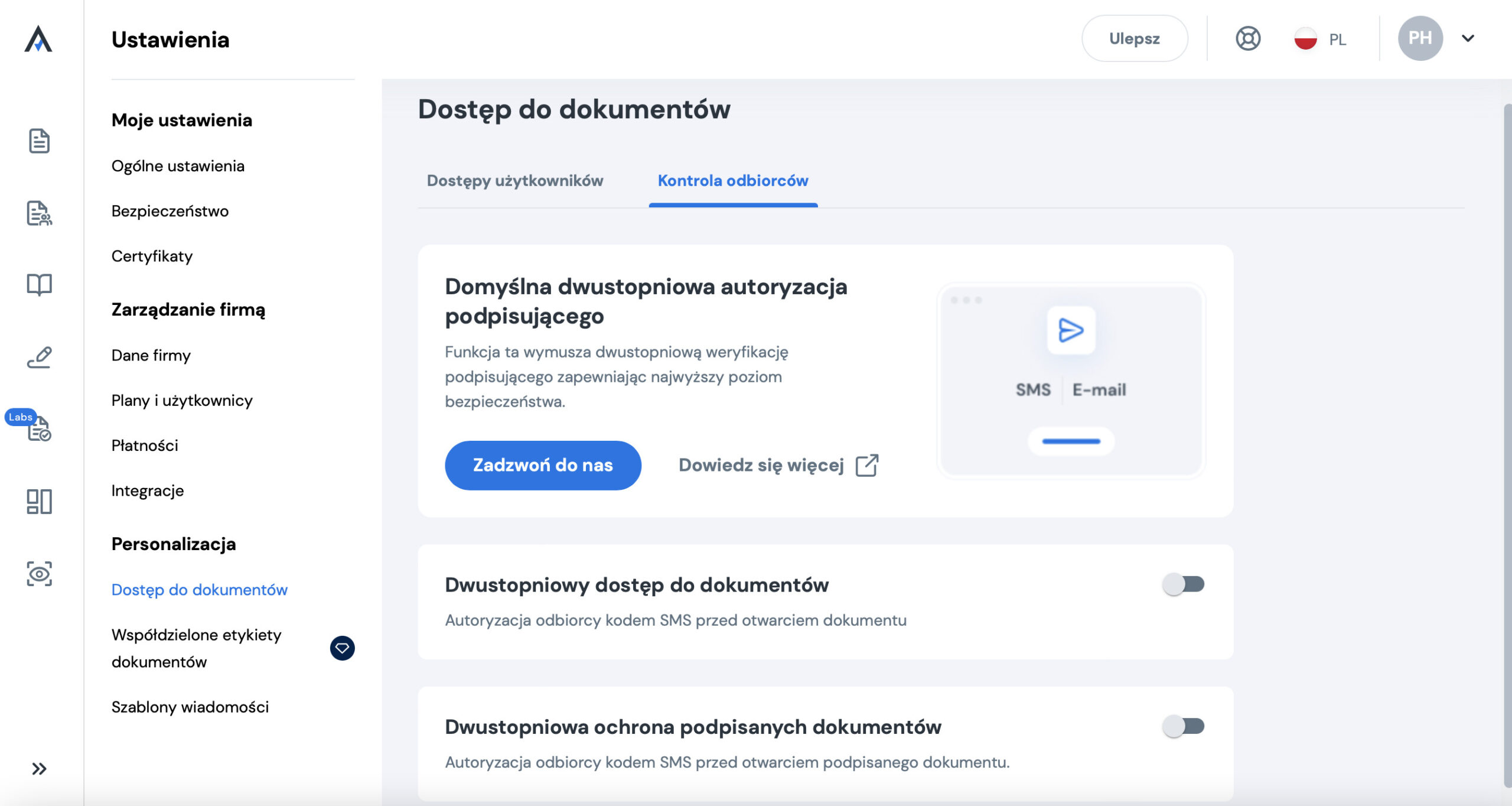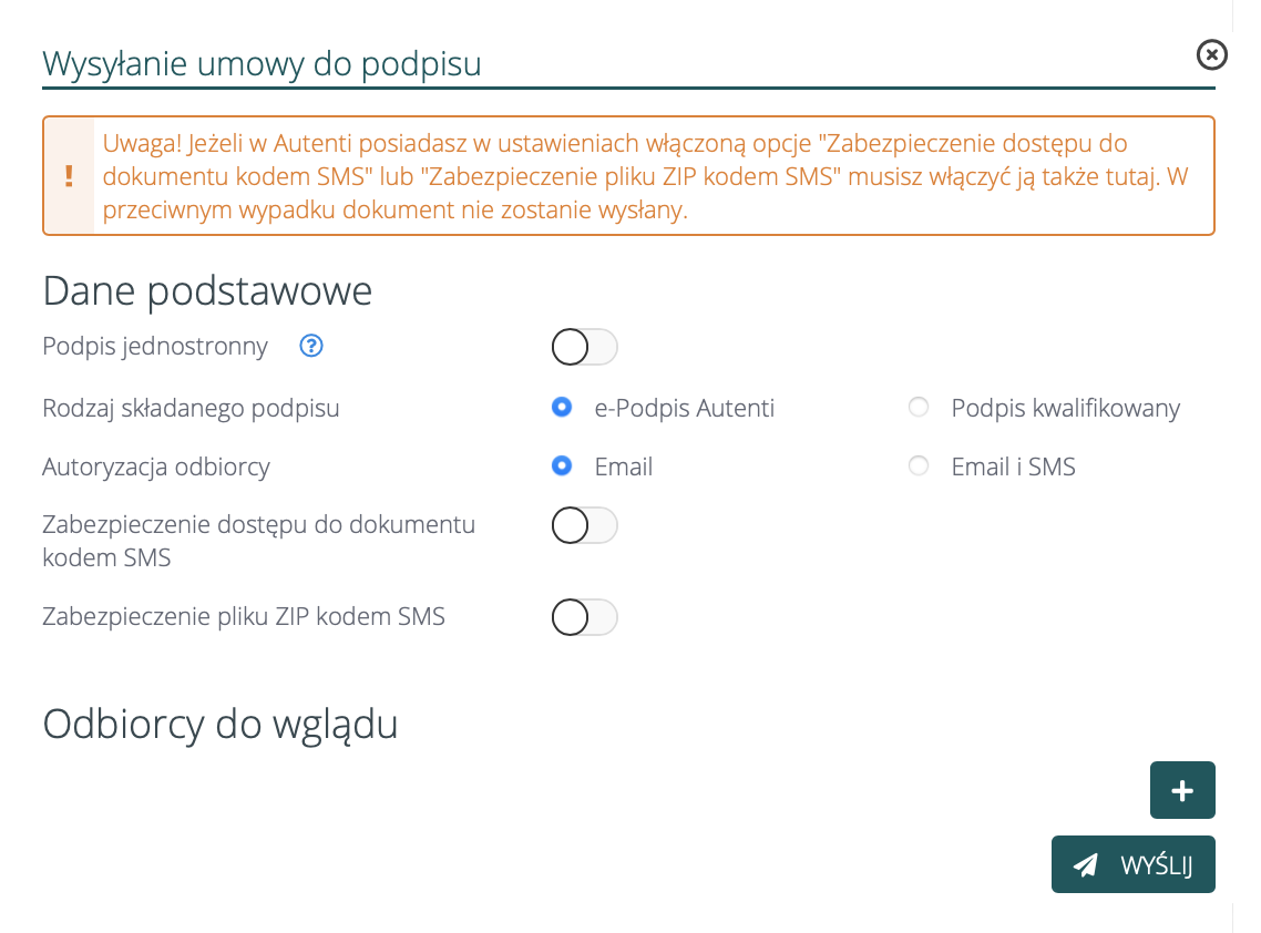 Ważne jest, aby po zalogowaniu się na https://autenti.com/ posiadać takie same opcje w ustawieniach, jak podczas wysyłania umowy do podpisu: