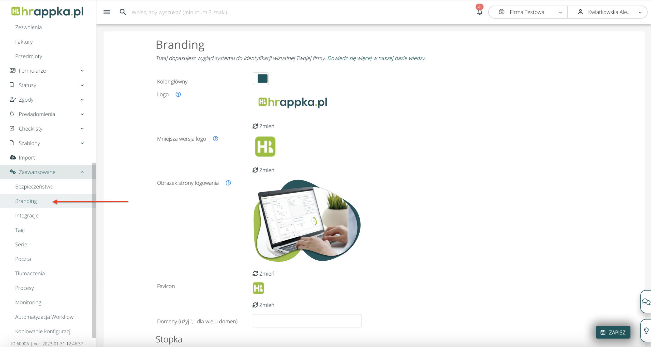 Aby dopasować wygląd systemu do brandingu Twojej firmy, należy przejść do Ustawienia > Zaawansowane > Branding.