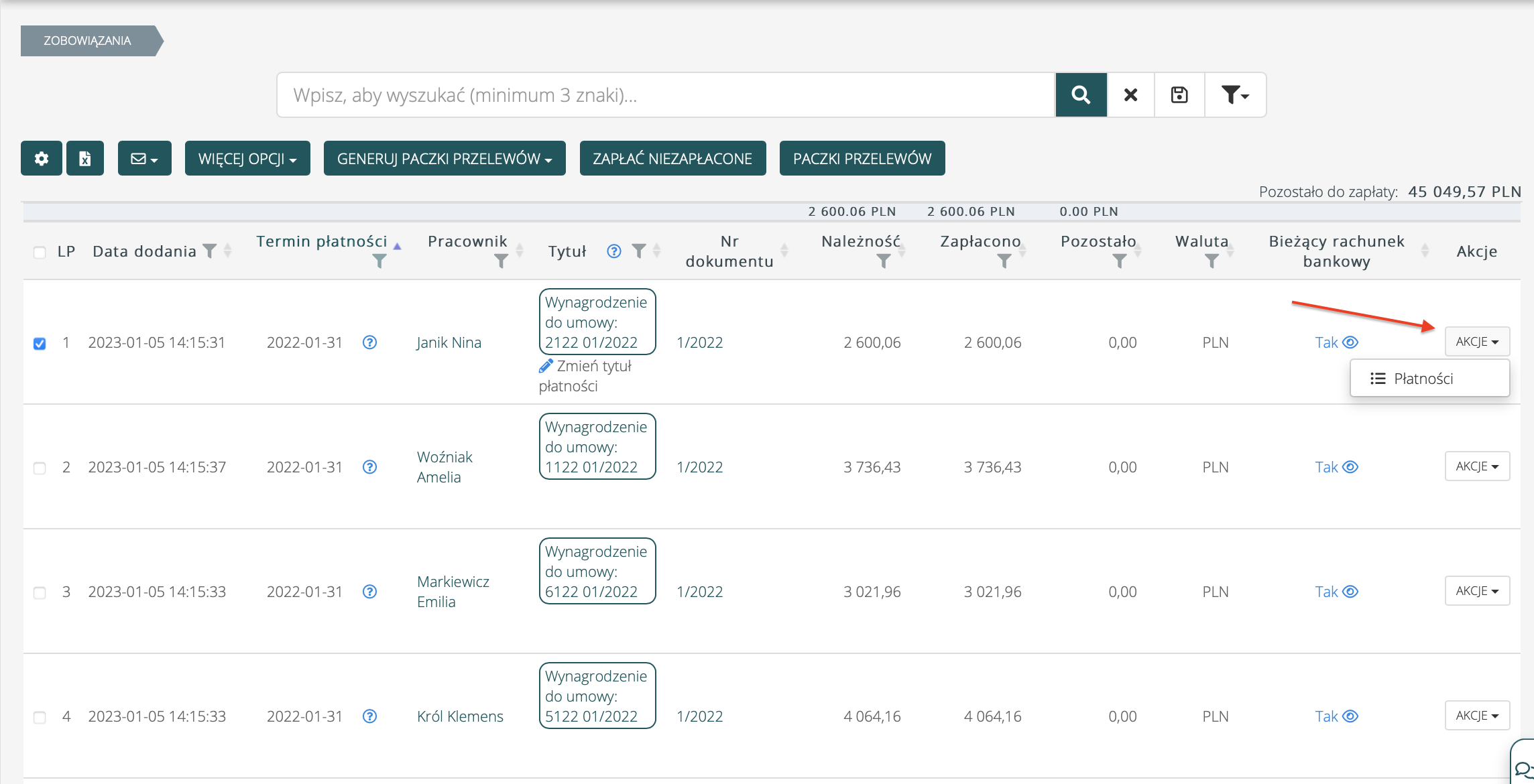 Aby usunąć płatności (oznaczyć je w systemie jako niezapłacone), przejdź do modułu Płatności > Zobowiązania i oznacz płatności jako niezapłacone korzystając z kolumny Akcje. Kliknij w przycisk Płatności.