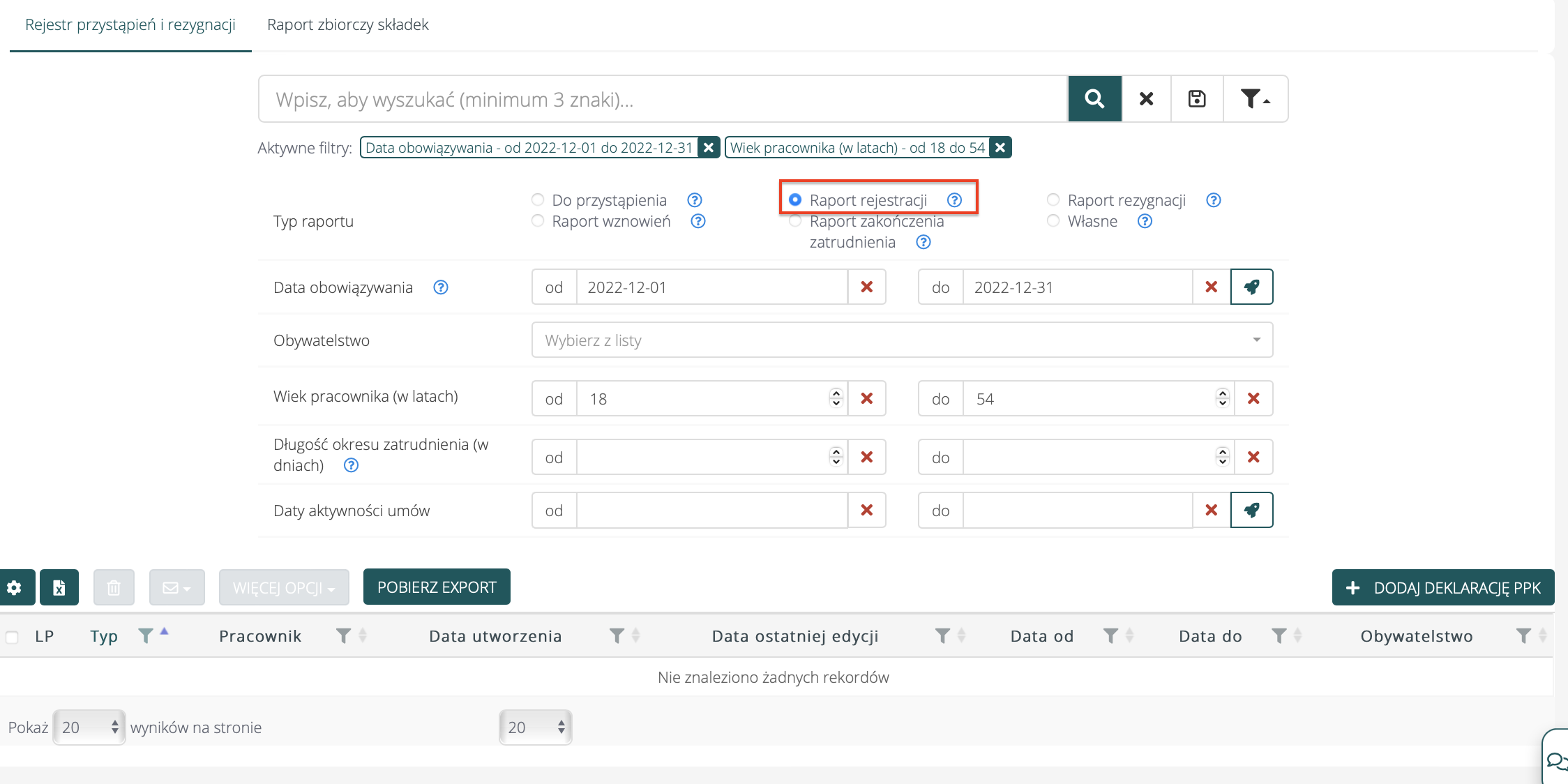 Aby znaleźć przystąpienia pracowników do PPK należy przejść do zakładki Deklaracje > PPK > Rejestr przystąpień i rezygnacji, a następnie korzystając z filtrów nad tabelą wybrać typ raportu – „Raport rejestracji”, a następnie kliknąć Zastosuj.