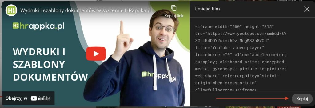 Z platformy, na której umieszczono film należy pobrać kod do wstawienia video.