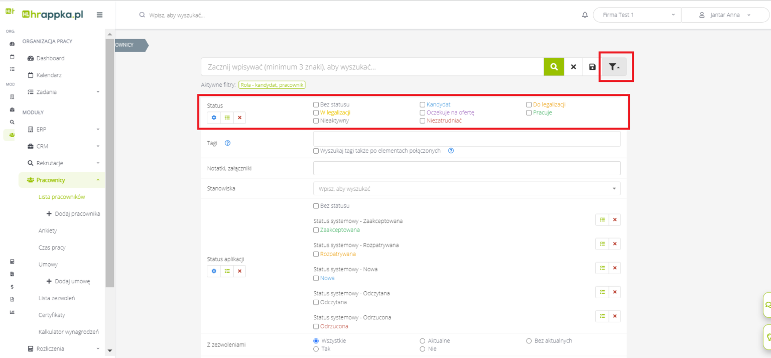 Na liście pracowników należy kliknąć w ikonkę lejka, a następnie w zakładce Status, w filtrach należy wybrać odpowiedni status i kliknąć w przycisk Zastosuj.