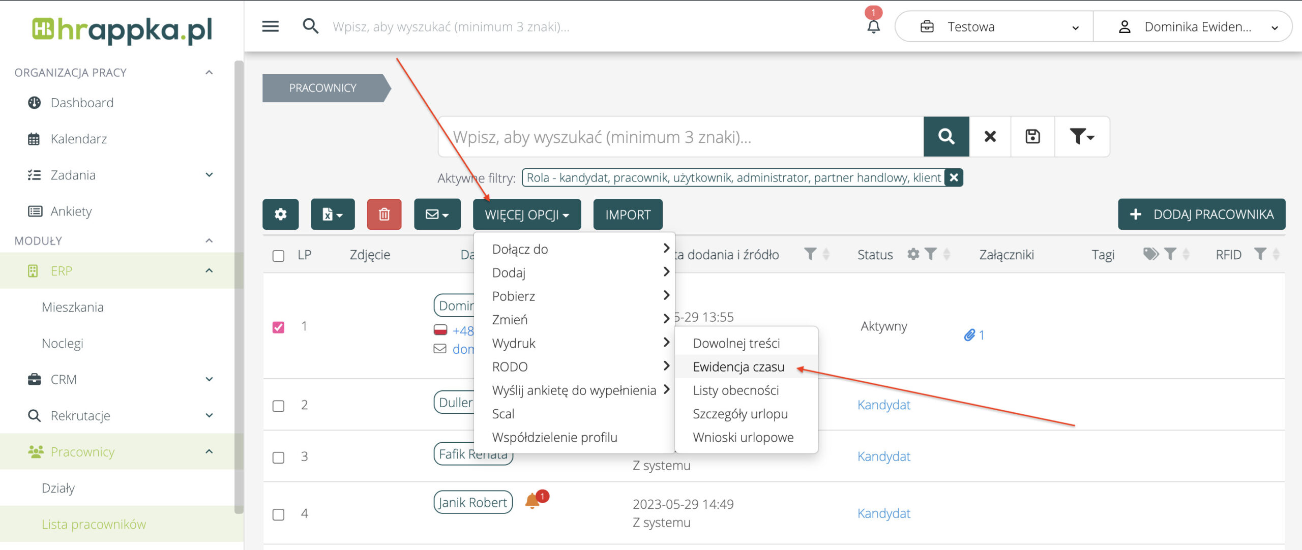 Pierwsza z nich to lista pracowników: po zaznaczeniu przynajmniej jednego rekordu checkboxem, podświetla się przycisk „Więcej opcji” nad listą, z którego wybieramy „Wydruk > Ewidencja czasu”, a następnie wskazujemy okres, za który chcemy wygenerować ewidencję: