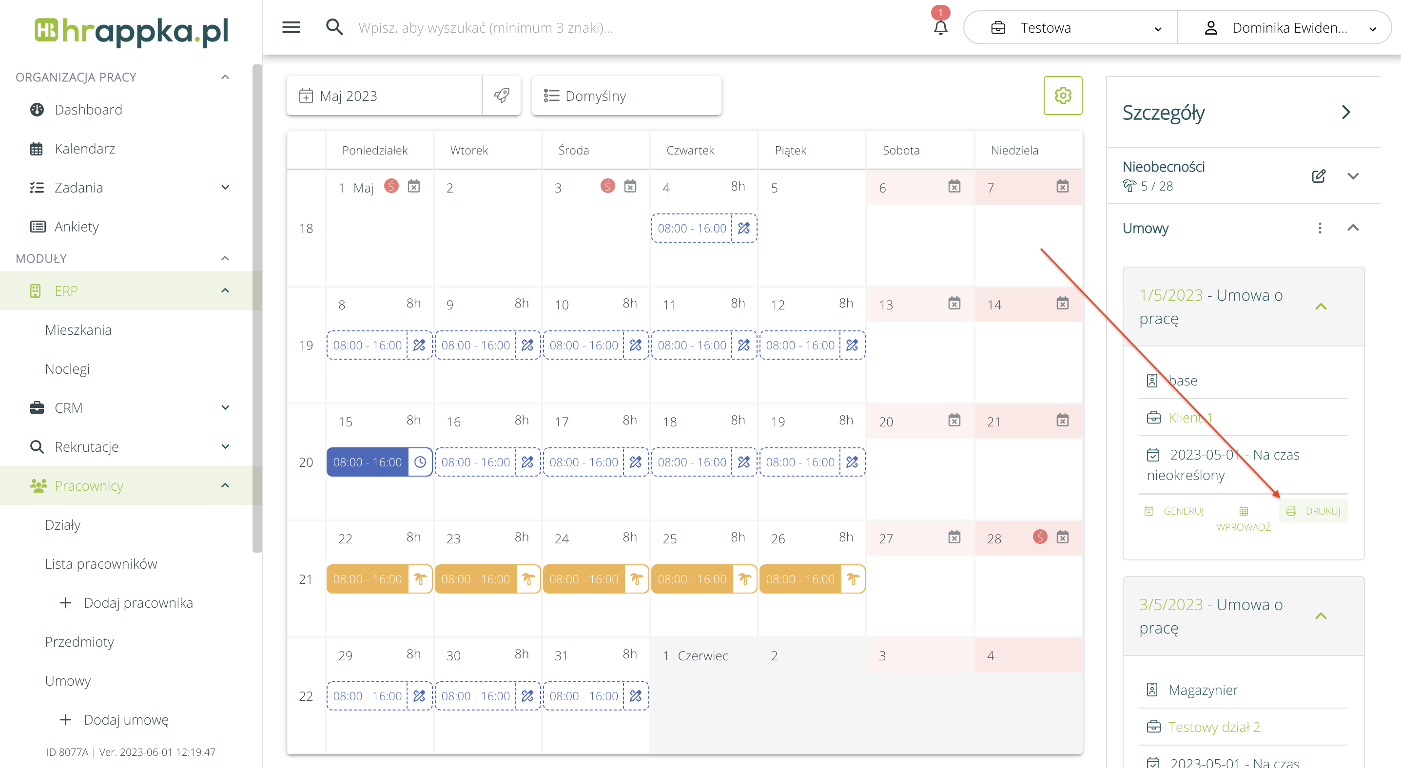 Drugą lokalizacją jest grafik pracownika, dostępny z poziomu jego profilu lub profilu jego umowy. Po wybraniu zakładki „Grafik”, po prawej stronie prezentowane są szczegóły aktualnych umów pracownika. Bezpośrednio przy szczegółach umowy znajduje się opcja „Drukuj”.