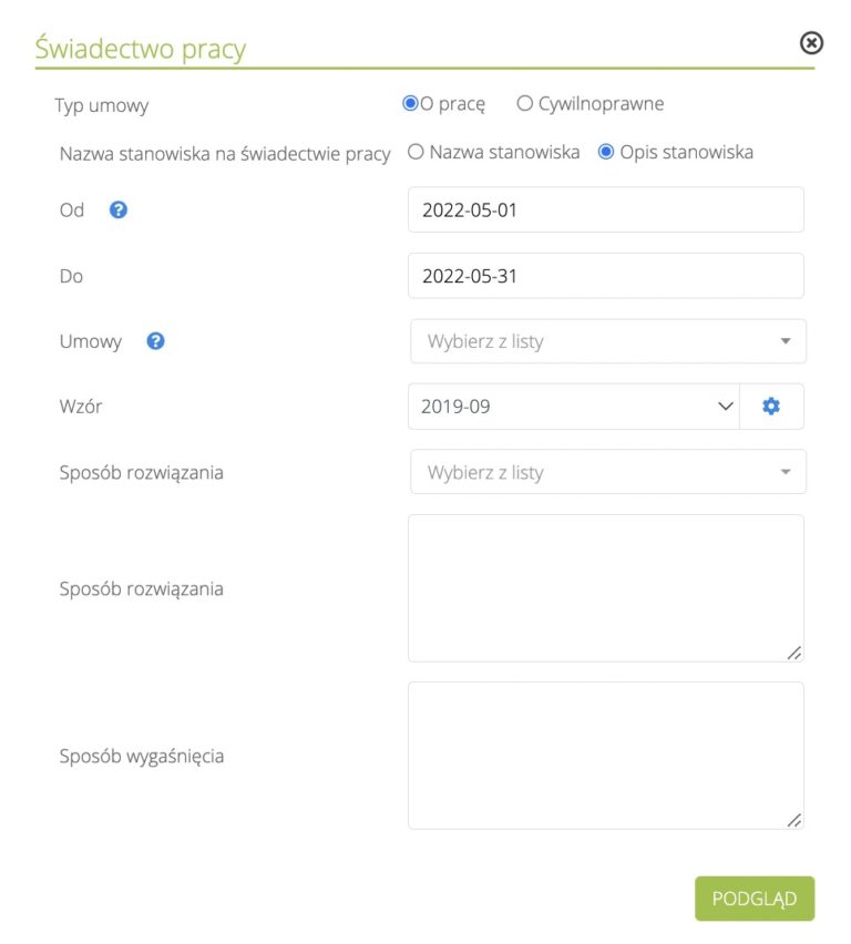 Po kliknięciu w świadectwo pracy pojawi się okno modalne, które pozwala wybrać szczegóły świadectwa: