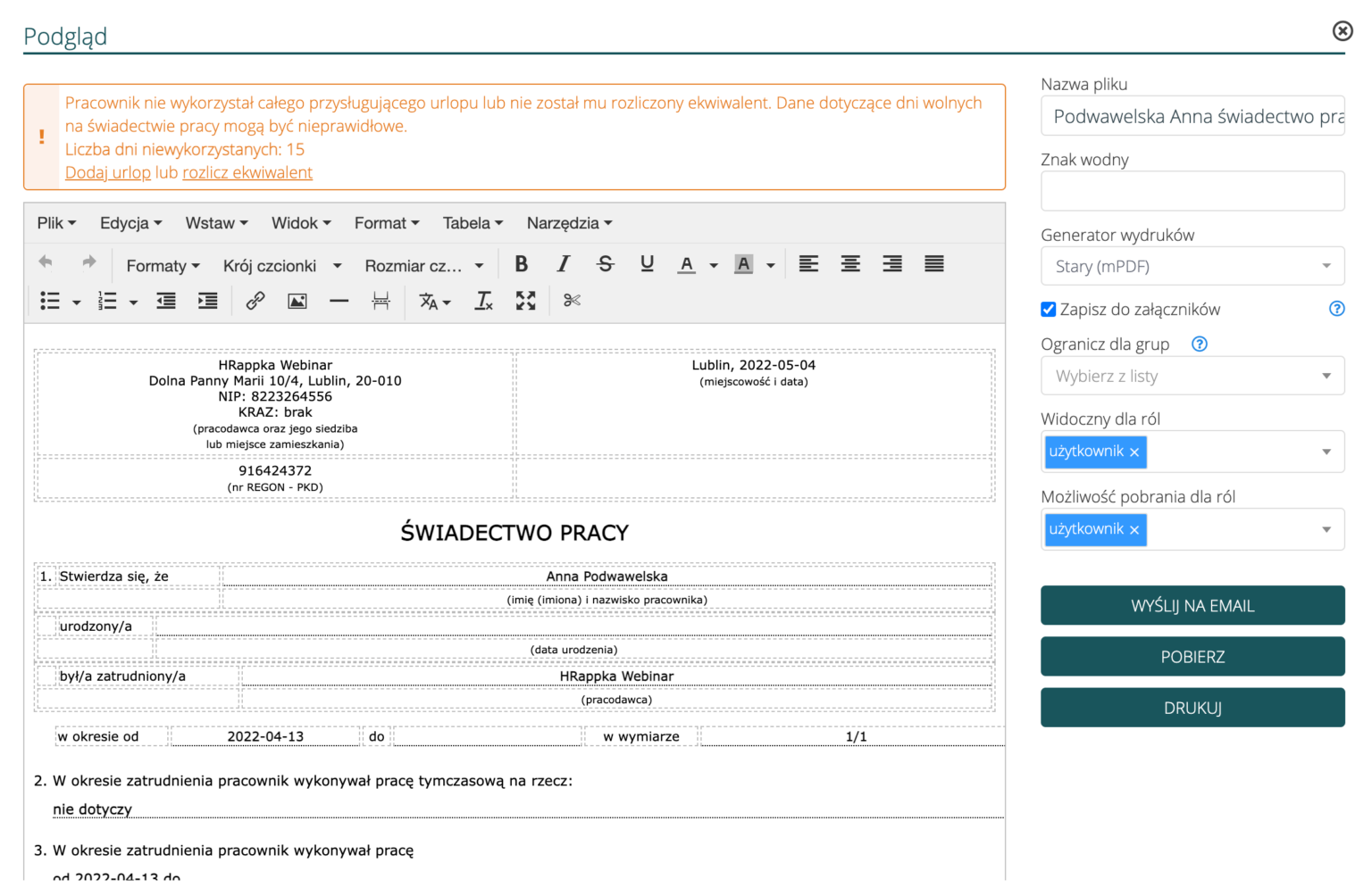 Po uzupełnieniu informacji o świadectwie należy kliknąć w „Podgląd". Spowoduje to pojawienie się wydruku. Możesz na nim sprawdzić poprawność wstawionych danych. Jeżeli istnieją nieprawidłowości (np. nierozliczony ekwiwalent), system wyświetli stosowną informację. Jest ona jedynie informacyjna i pozwala wygenerować świadectwo pracy pomimo sugerowanych przez system nieprawidłowości. Po weryfikacji danych możesz przejść do jego zapisania, pobrania lub wysyłki. W panelu po prawej stronie możesz: Wskazówka: Aby funkcja „Zapisz do załączników" była domyślnie automatycznie zaznaczona przejdź do Ustawienia > Szablony > Wydruki > Ustawienia wydruków i zaznacz opcję „Zapisz domyślnie wydruki w załącznikach". Przyciski akcji pozwalają wysłać świadectwo pracy na email, pobrać je lub wydrukować.