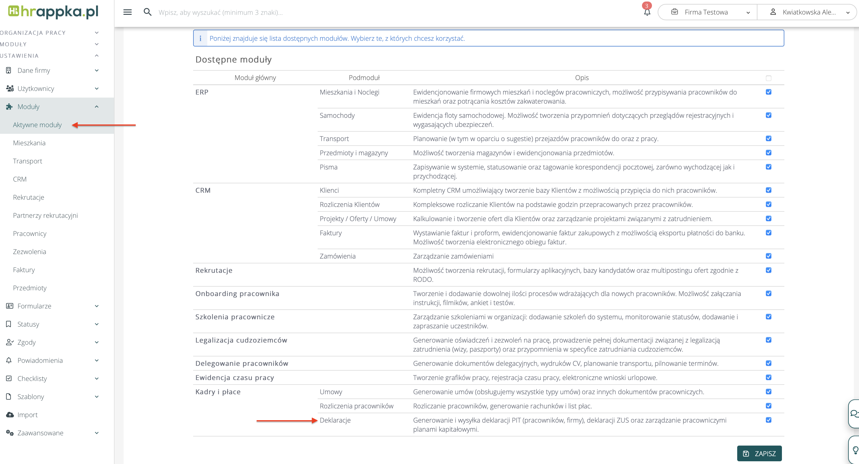 Uwaga! Jeżeli nie widzisz modułu Deklaracje, przejdź do sekcji Ustawienia > Moduły > Aktywne moduły.